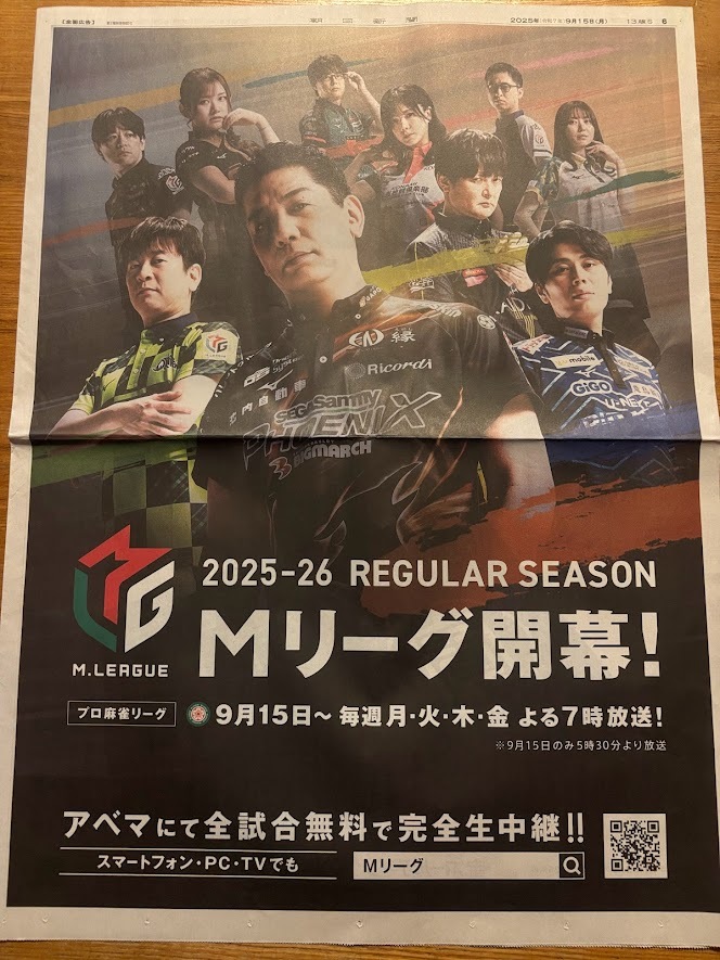 朝日新聞 2025年9月15日(月) 掲載紙面より 新聞 カラー広告 全面広告 切り抜きです。 Mリーグ開幕 M.LEAGUE 掲載紙面のみ四つ折りにしてお送りします。 新聞紙のため、年数経過によるヨレやキバミなど充分にご理解頂いている方のみ宜しくお願いします。 | ||||||||