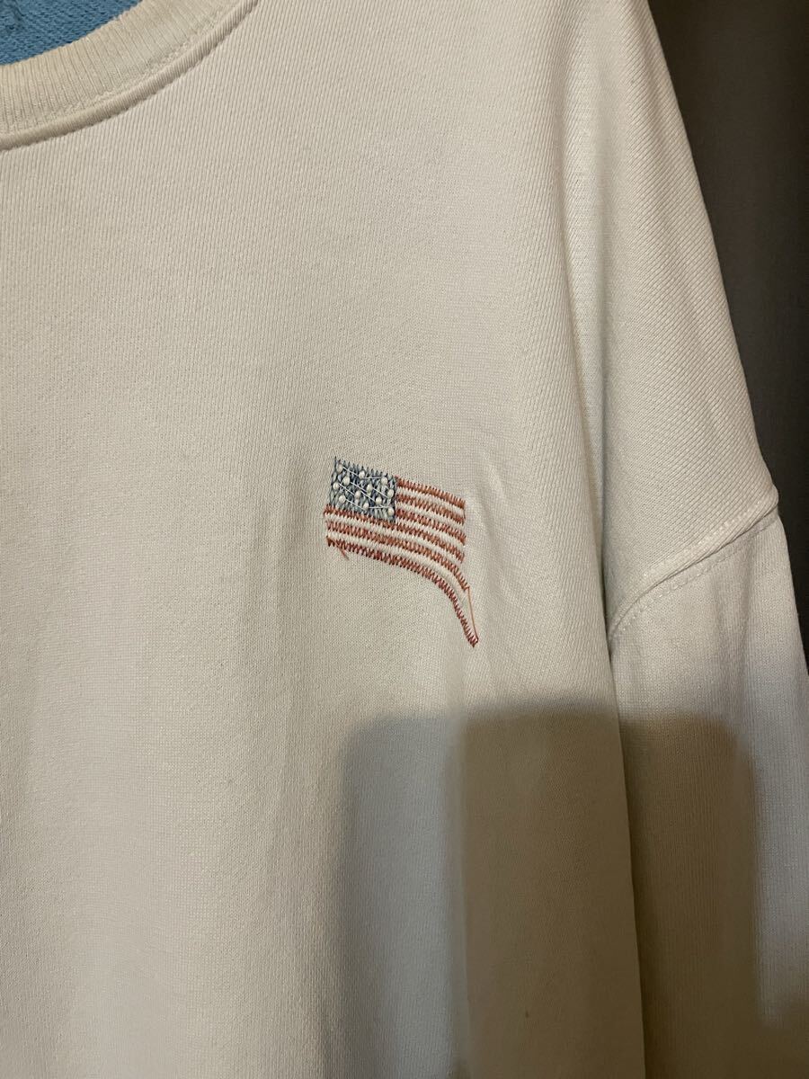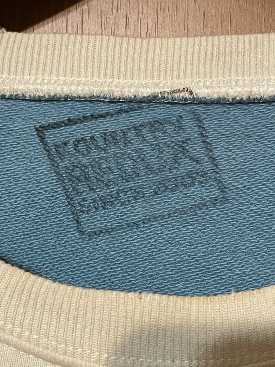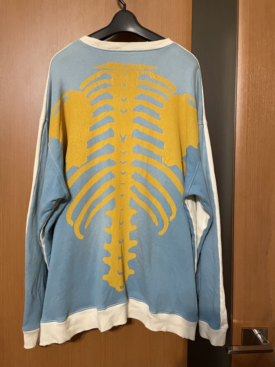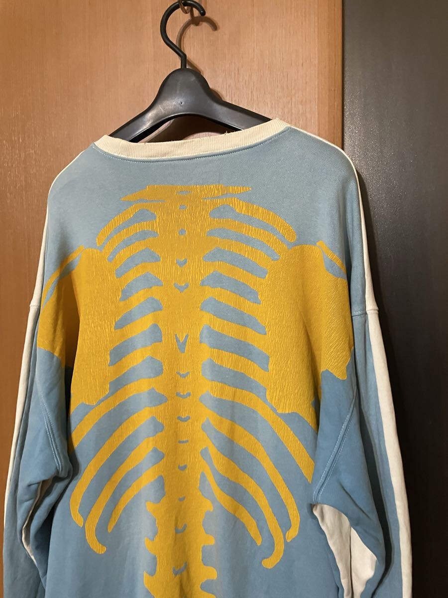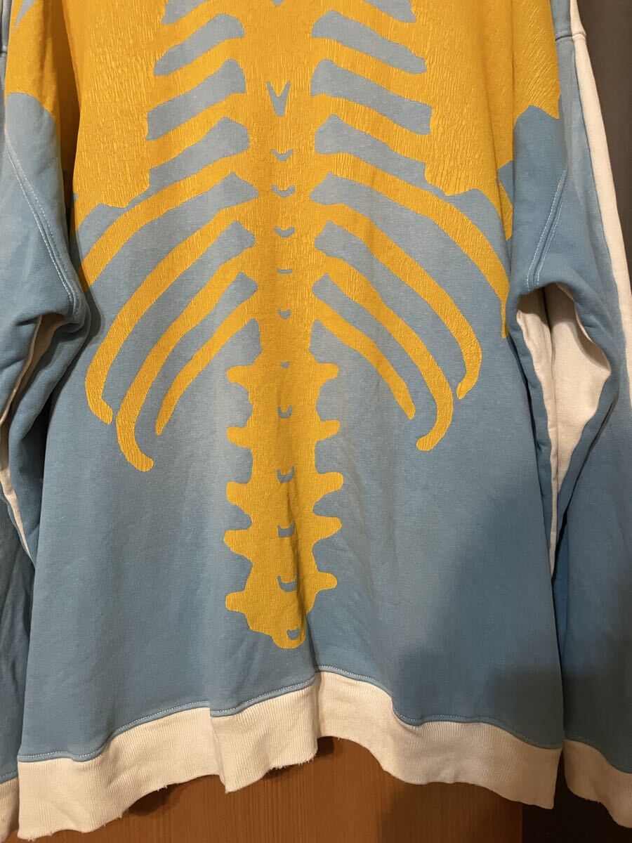 バックに大きくプリントされた骨のデザインがキャッチーなスウェット。ホワイトベースにサックスとイエローの好配色です。