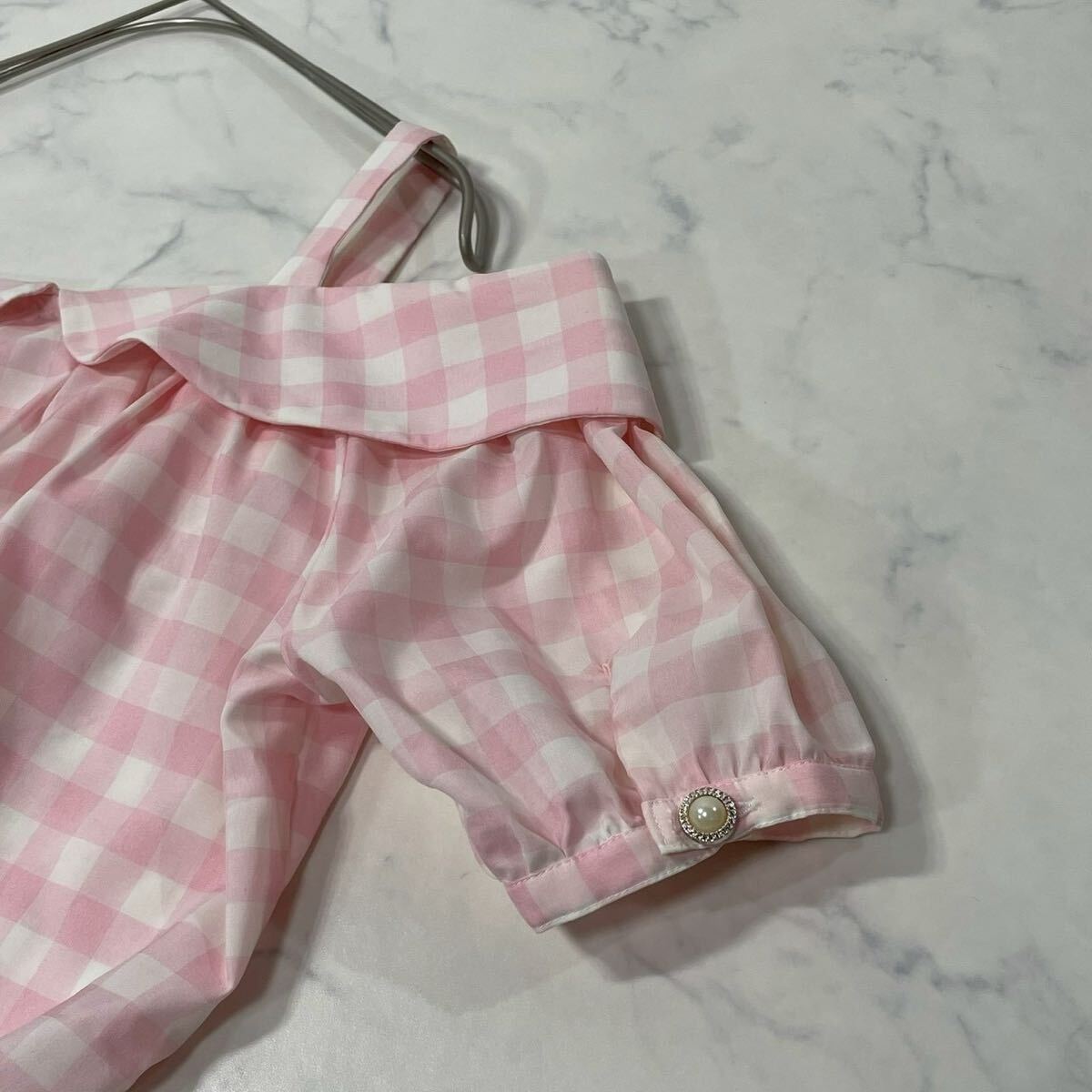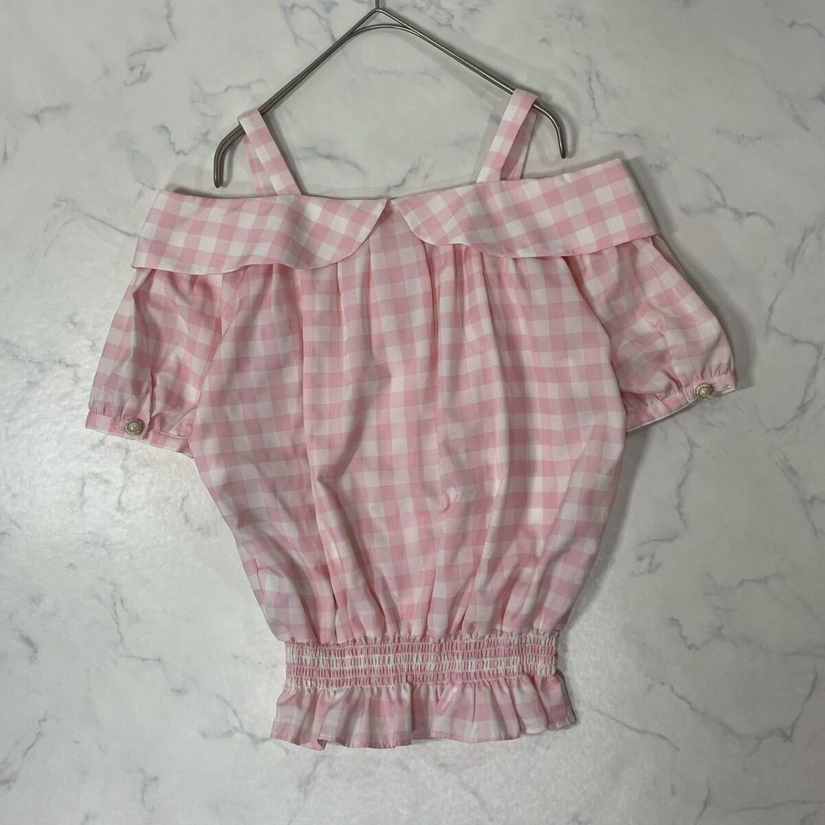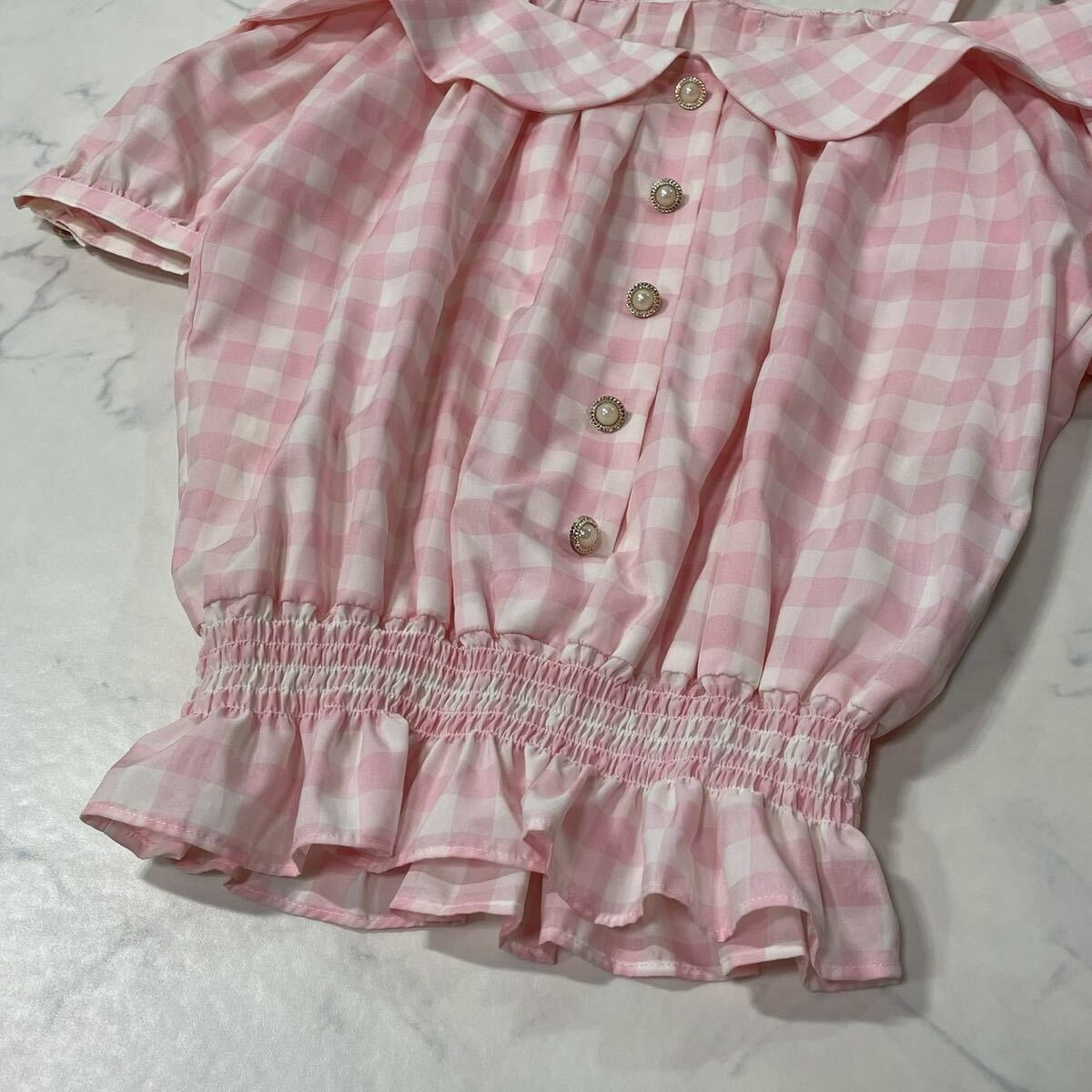 チェック ギャザー タック シャーリング 飾りリボン ボタン ショールカラー ラグラン 肩紐 半袖 ブラウス