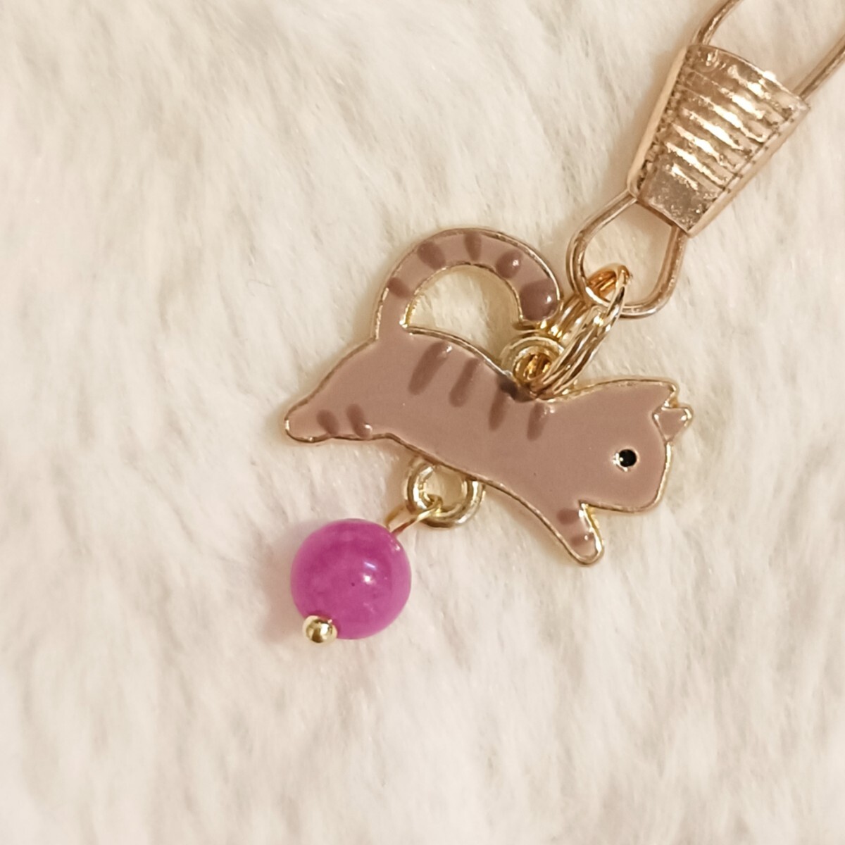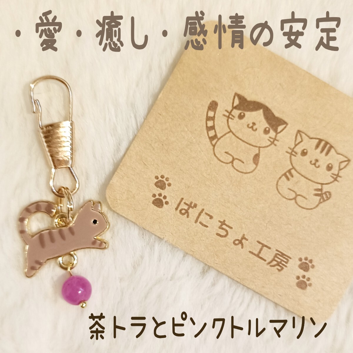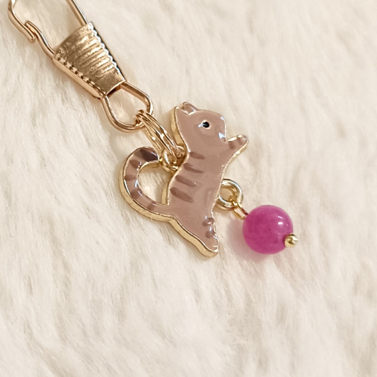 わが家のニャンコたちをイメージして描いたチャームにパワーストーンを添えたキーホルダーです(=^・^=)