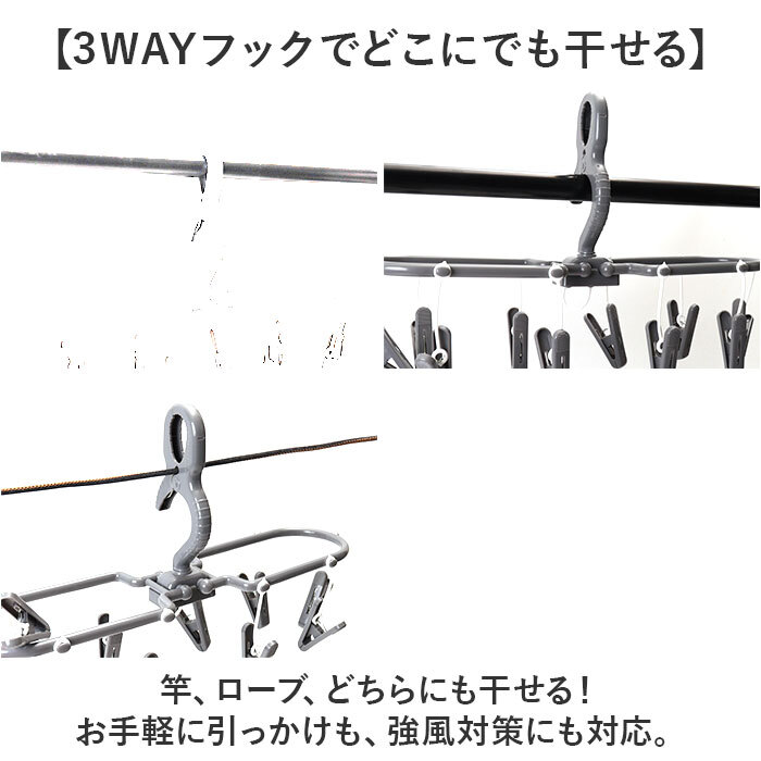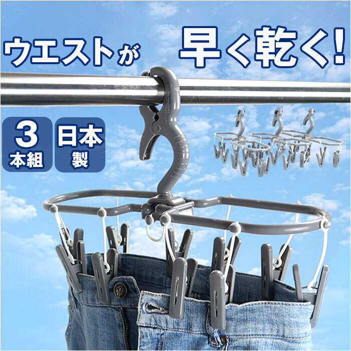 | 商品説明 | ・・【ジーンズのウエストが早く乾く!】 ・コンパクトサイズで扱いやすく、靴下などの小物も干せる!ジーンズ&小物干し3本組が登場。 ・【ジーンズやスラックスのお洗濯に】 ・乾きにくいウエスト周りを広げて干せ、風通りをUP!生乾き臭の予防や時短に役立つアイテム。 ・【ぐるりと配置されたピンチ】 ・片手で持てる扱いやすいサイズ。引っかけループ付きでコンパクトに収納。旅行などで携帯もOK ・【ロック回転クリップで干しやすい】 ・お好みの干しやすい向きに、45度ごとにロックできる!クルクル回る煩わしさを解決◎ ・【3WAYフックでどこにでも干せる】 ・竿、ローブ、どちらにも干せる!お手軽に引っかけも、強風対策にも対応。 ・【まとめ洗いもできる3本セット】 ・まとめ洗い時や、小物干しと併用ができる嬉しい3本セット。ストック用にも◎ |