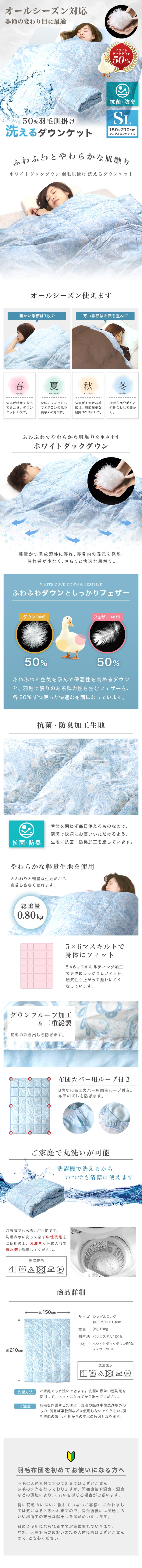 羽毛布団 羽毛ふとん シングル 掛け布団 洗える ダウンケット ホワイトダックダウン 50% 150×210cm オールシーズン ブルー