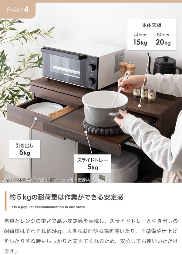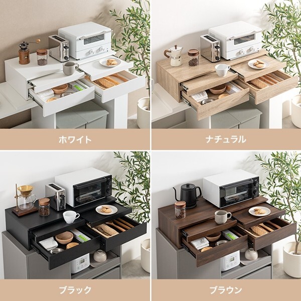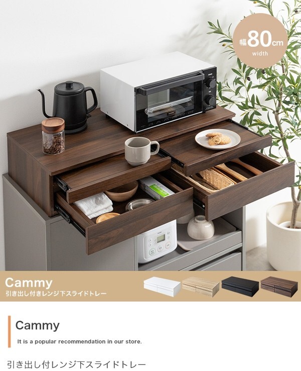 ※現在ご覧の商品ページはブラックのご購入ページとなります。 ヤフオクの仕様上単一ページに複数バリエーションを掲載することができませんので、他バリエーションが希望の場合は別ページでご購入お願い致します。 レンジ下を有効的に活用する『Cammy(キャミー)』レンジ下収納。 ちょい置きできるスライドトレーとワイドな引き出しで、手狭なキッチンをすっきり整理し快適に。 幅50cmタイプと幅80cmタイプの2つのサイズをご用意したため、置きたい場所や用途に合わせお好きな幅をお選びいただけます。 また、レンジや炊飯器などキッチン家電の下に省スペースで設置できるため、今の環境を大きく変えないまま、作業効率を大幅アップすることが可能です。 配達業者を指定いただくことはできません。 沖縄・離島に関しましては、別途配送料が必要となります。 北海道への配送も別途配送料が必要になる場合がございます。 ※別途送料が発生する場合は後ほどご連絡させていただきます。 タイミングによっては在庫切れの場合があります。