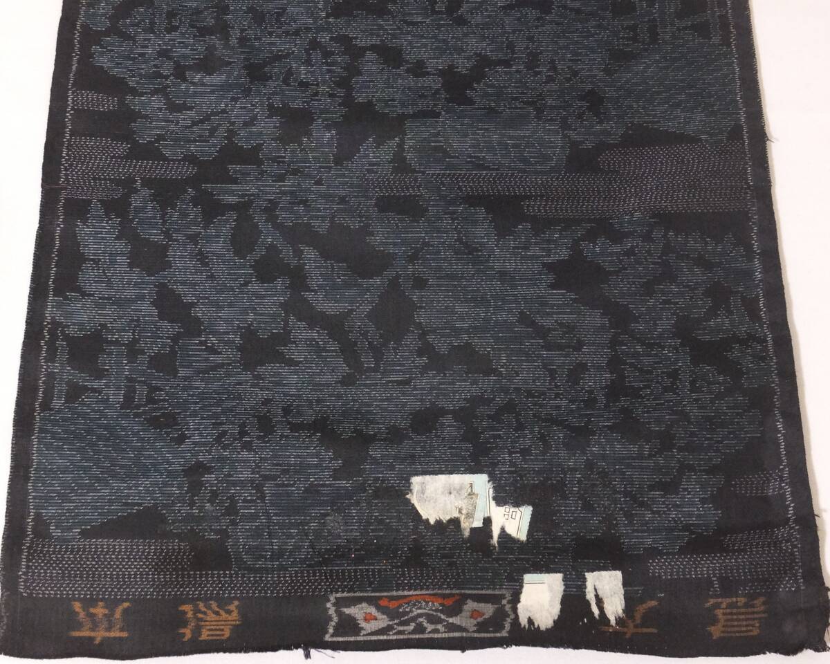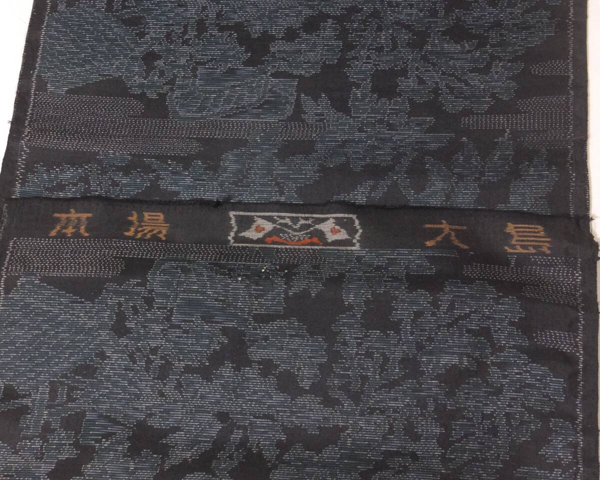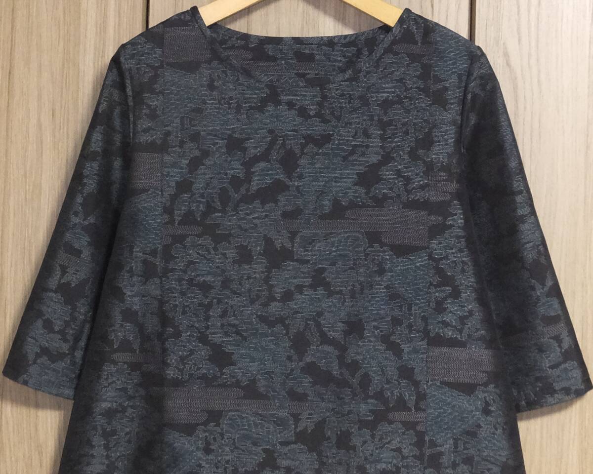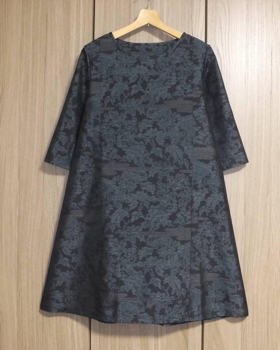 ♪送料無料 ハンドメイド 着物リメイク 古布 正絹 本場大島紬 草花 黒×紺 シンプルAラインワンピース♪