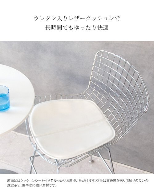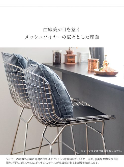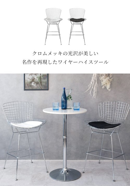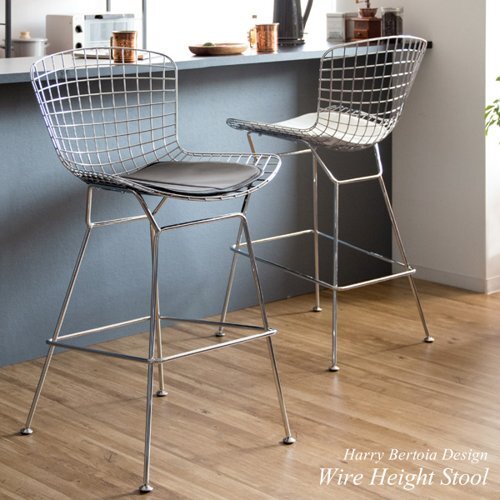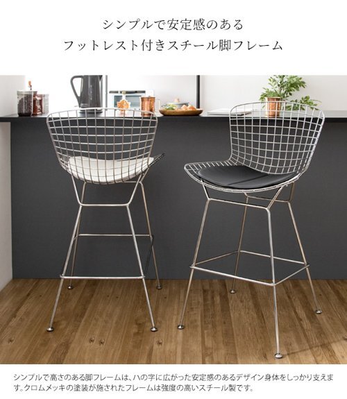 現在ご覧の商品ページはホワイトのご購入ページとなります。 ヤフオクの仕様上単一ページに複数バリエーションを掲載することができませんので、他バリエーションが希望の場合は別ページでご購入お願い致します。 1脚の販売となります。 配達業者を指定いただくことはできません。 北海道/沖縄/離島のお届けに別途中継料金が発生します。 ※別途送料が発生する場合は後ほどご連絡させていただきます。 イームズやジョージ・ネルソンと並ぶ、ミッドセンチュリー期の代表的なデザイナー、ハリー・ベルトイアがデザインしたワイヤーハイスツールのリプロダクト品。 スチールのワイヤーが網目状に構成された背もたれは軽量かつ耐久性に優れております。広々とした座面はレザークッション付きでお尻が痛くなりにくく、くつろげるデザインです。座面高70cmとカウンターやバーテーブルに最適。 座面のクッションはブラックとホワイトの2カラーをご用意。お好みでお選びいただけます。 タイミングによっては在庫切れの場合があります。