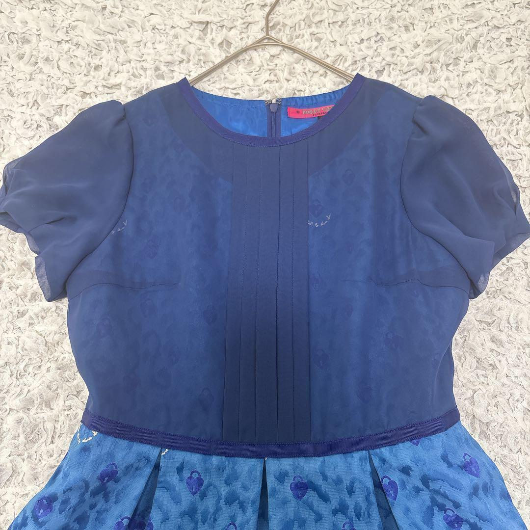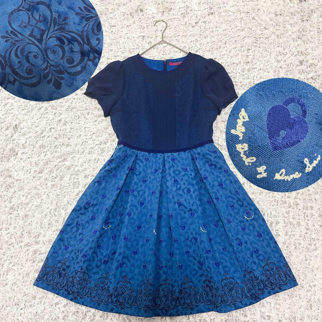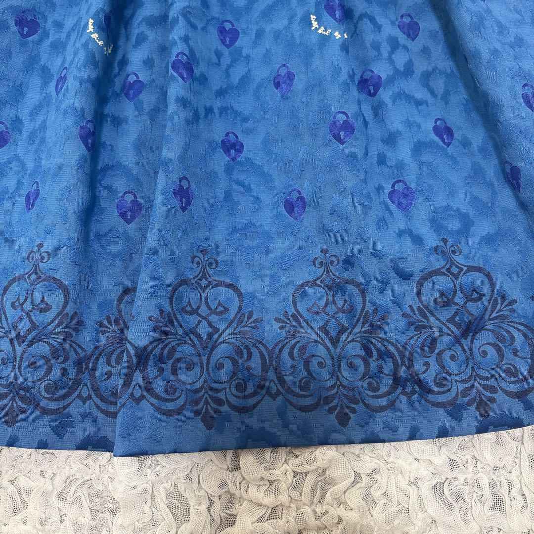 ハートモチーフにブランドロゴが入った模様のワンピース。シフォン素材から透けて見えるハート・ロゴも可愛い♪プリーツが上品で、裾の柄が個性的。綺麗なカラーのしっかりしたお作りの一着。今はもうないドーリーガールの貴重なドレスです