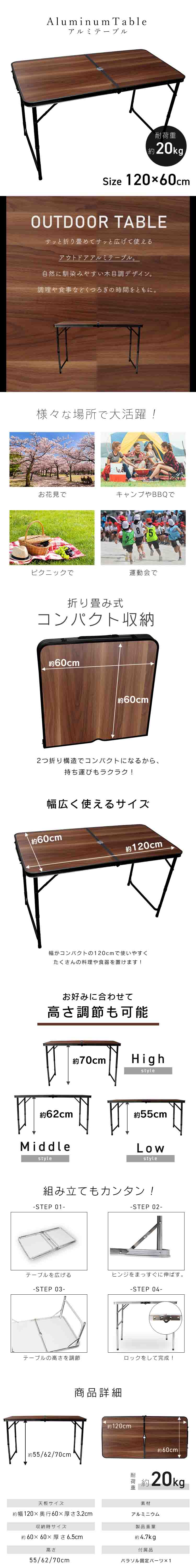 | かんたん組立の折りたたみ式アウトドアテーブル(4~6人用)です。 コンパクトサイズの120cm×60cm!! サビに強いアルミを使用! 天板には防水加工が施されています。 必要のない時は折りたたんで収納できる! 取っ手付きで持ち運びもラクラク♪ 高さは「ハイスタイル」「ミドルスタイル」「ロースタイル」の3段階調節。 お好みや用途に合わせて使い分けることができる嬉しい仕様♪ キャンプ、バーベキュー、お花見などにとても便利! ■商品コード:A61B010DWN ■商品仕様 カラー:ダークウォルナット サイズ:(約)120cm×60cm×高さ55~70cm(高さ3段階調節可能) 収納サイズ:(約)60cm×60cm×6.5cm パラソル用ホール直径サイズ(約):26mm 重量:(約)4.7kg 耐荷重:(約)20kg 材質:アルミニウム ■内容 テーブル本体、パラソル固定パーツ×1 ■注意事項 ・初めてご使用の場合、耐久性を高めるために天板がフラットにならず山なりになっております。 適度な力で上から押していただくと改善されますので、お試しください。初期不良ではございません。 ・海外製品で、簡易梱包での輸入のため風防に擦れや多少の小キズなどがある場合がございますが、 商品自体には問題ありませんのでご了承下さい。 ・商品は、モニターによって色合いが異なって見える場合があります。 ・仕様・デザインは改良のため予告なく変更することがあります。 ■保障期間 7日間 ※商品到着後7日以内の初期不良・破損のみご対応させていただきます。 【新品未使用品です】 |