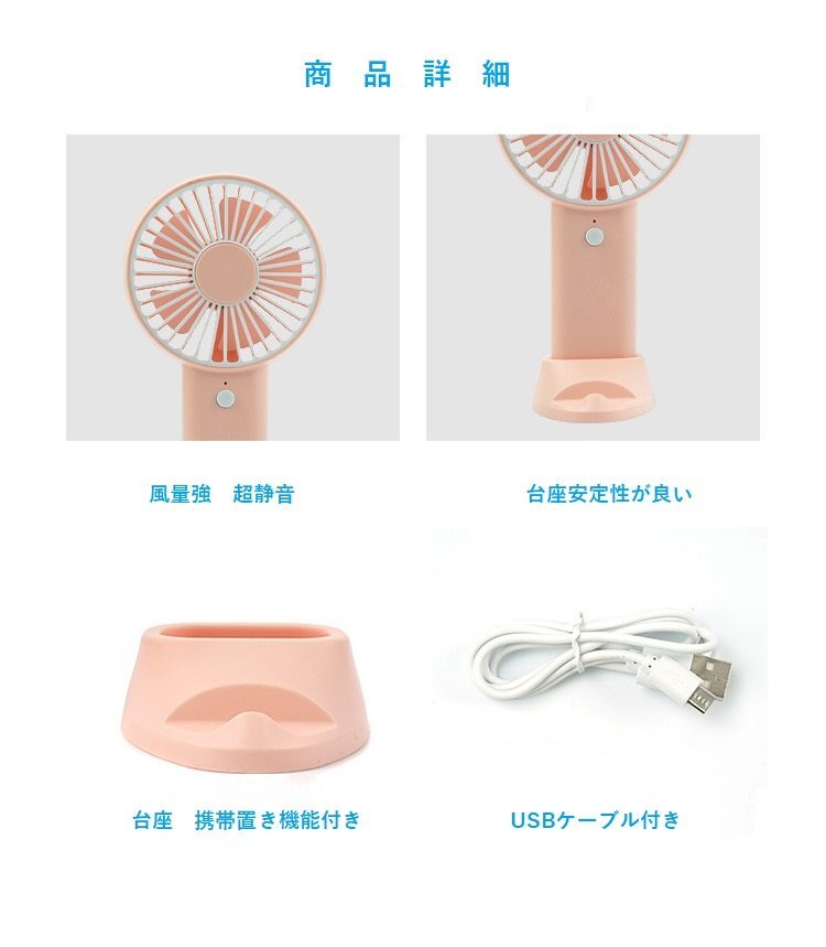 関連キーワード: ミニ扇風機 4000Mah大容量 長持ち 扇風機 風量調節 手持ち 小型扇風機 暑さ対策グッズ 熱中症対策 卓上扇風機 ミニファン USB充電式 3段風量調節 卓上扇風機 熱中症対策 携帯扇風機 卓上扇風機 ポータブル扇風機 usb充電 携帯便利 軽量 小型 スポーツ ミニ扇風機 ホワイト ピンク かわいい 携帯置き機能付き ■仕様 商品名:携帯置き小型ハンディミニ扇風機 商品型番:7CUJ カラー:ホワイト 数量:1PCS 風力パワー:4W 電源:DC5V/1000mA バッテリー容量:4000Mah 使用時間:最大8時間 充電時間:3~4時間 製品重さ:200g 製品サイズ:228*110*42mm 材質:ABS ■使用方法 ・ボタン一つで3段階【弱 中 強】の風量調整を行います。 ・ボタンー1回押し風量弱、2回押し風量中、3回押し風量強となります。 ■付属品 ハンディ扇風機本体、USBケーブル、卓上台座、 手持ちで小型扇風機です、持ち運び便利です。学校や買い物や花火大会など歩きながら使用できます。とても実用幅広く使えます。 ■注意 ※ご使用する前に必ずご充電ください。 ※充電池は本体に内蔵されており、交換できません。 ※防水仕様ではありませんので、屋外使用時は降雨等にご注意ください ※本製品を使用して発生しうる事故、損害、損傷、破損などさらに二次的※事故損害についても責任を負いかねます。 ※製品の初期不良に関して、商品到着より1週間程度であれば、交換などの対応をさせていただきます。その他の製品以外に発生したいかなる費用も一切保証いたしません。ご理解頂けない方はご遠慮ください.