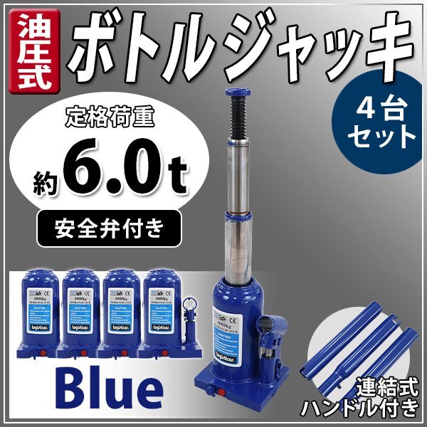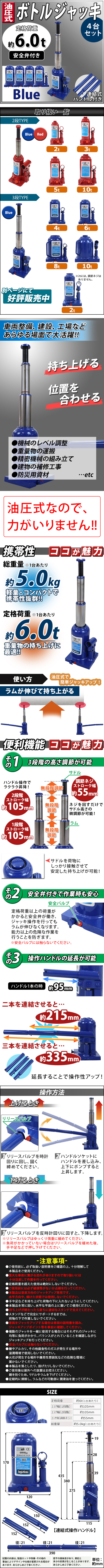 | 商品名 | 送料無料 ボトルジャッキ 油圧式 最高位約435mm 定格荷重約6t 約6.0t 4台セット 4個 油圧ジャッキ 二段階 三段階 多段階 だるまジャッキ ダルマジャッキ ジャッキ 手動 安全弁付き ジャッキアップ ハイアップ タイヤ交換 工具 整備 修理 メンテナンス 作業 bjackt0066t4p |