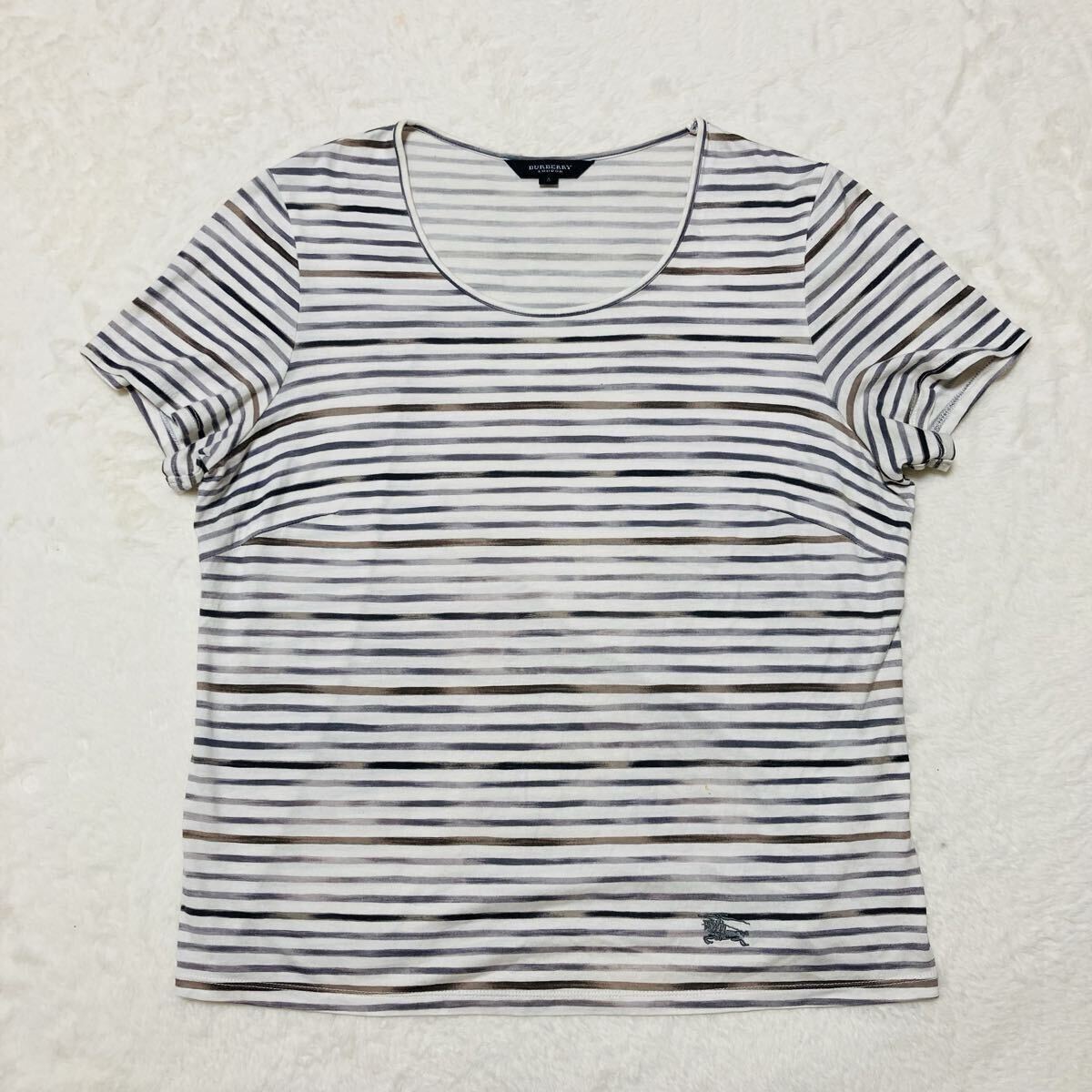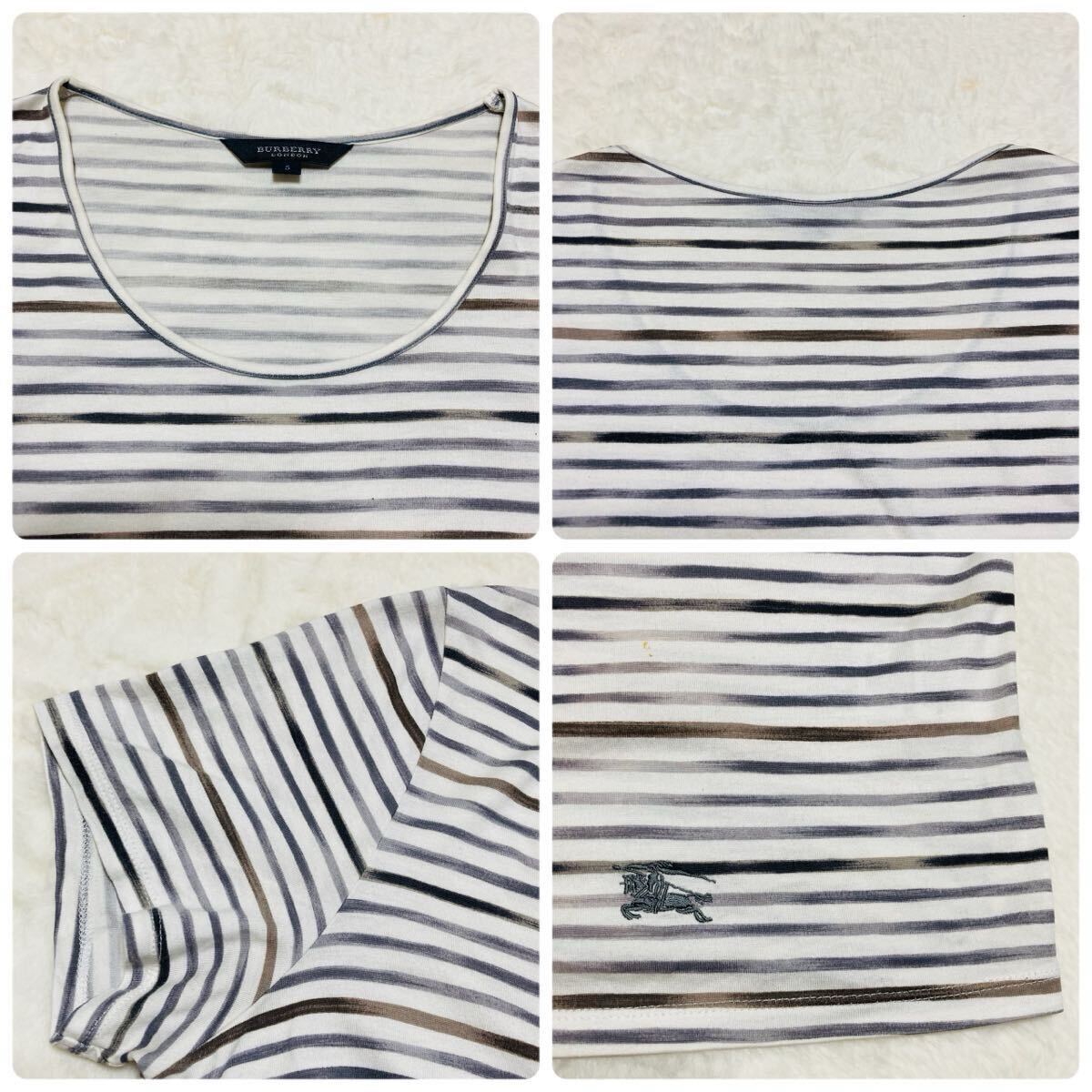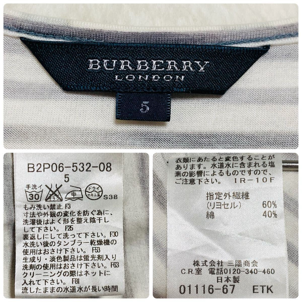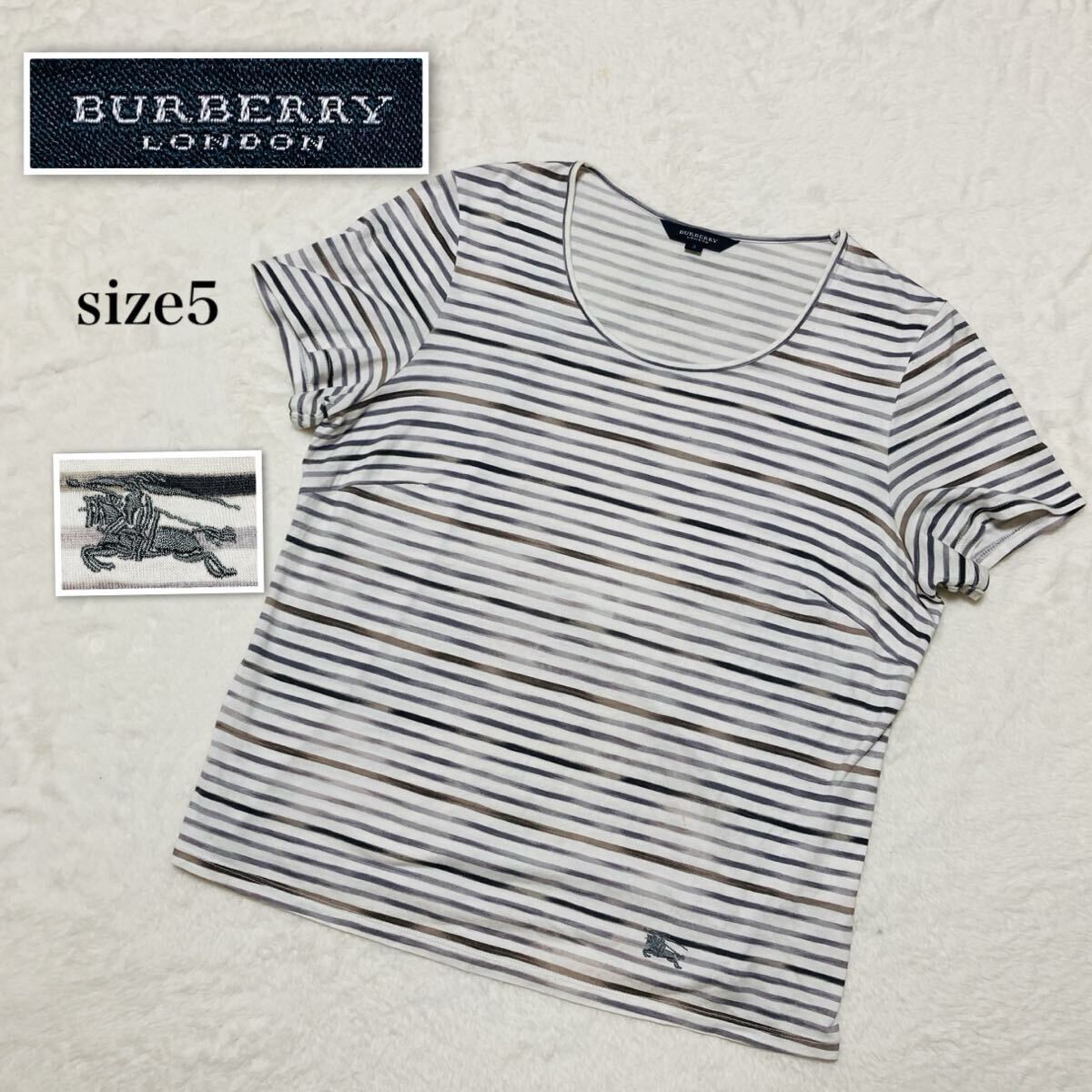 BURBERRY LONDON バーバリーロンドン 半袖Tシャツ size5 ボーダー ワンポイント刺繍ロゴ 三陽商会 日本製 グレー×ブラウン×ホワイト
