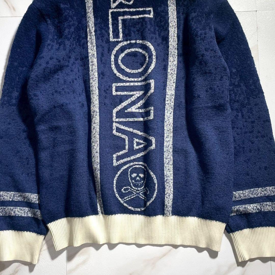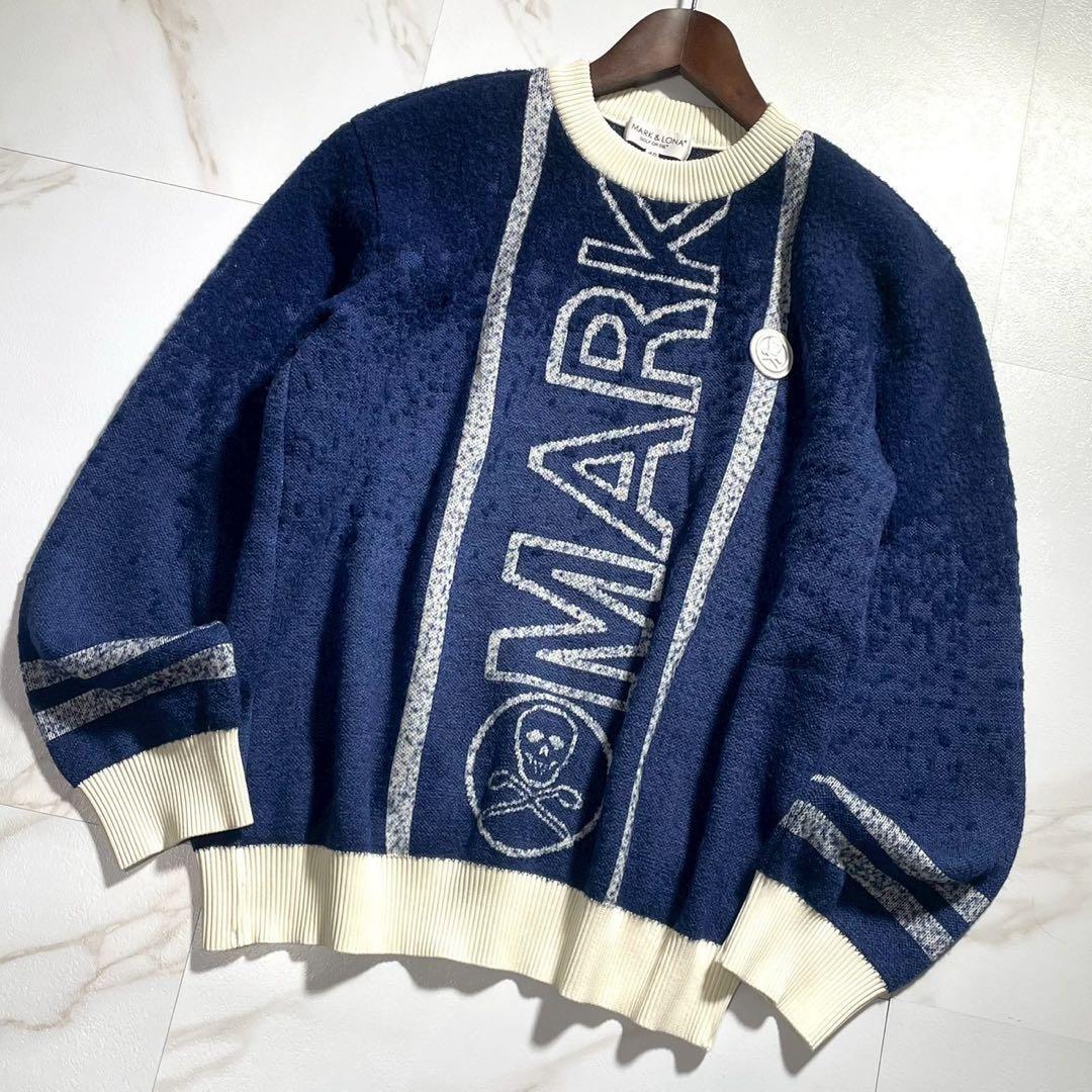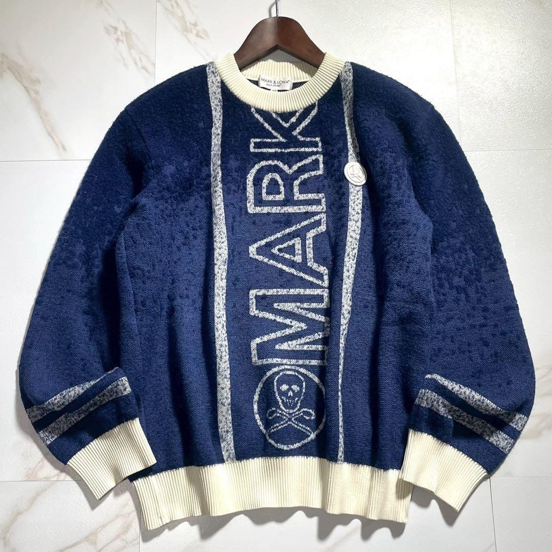 大きくデザインしたボーダーラインがスポーティな印象のプルオーバーニット。前後身頃にサークルスカルとMARK & LONAのロゴをジャカードで大胆に表現しました。左胸にはメタリックなホワイトカラーのサークルスカルワッペンがキラリと輝きます。