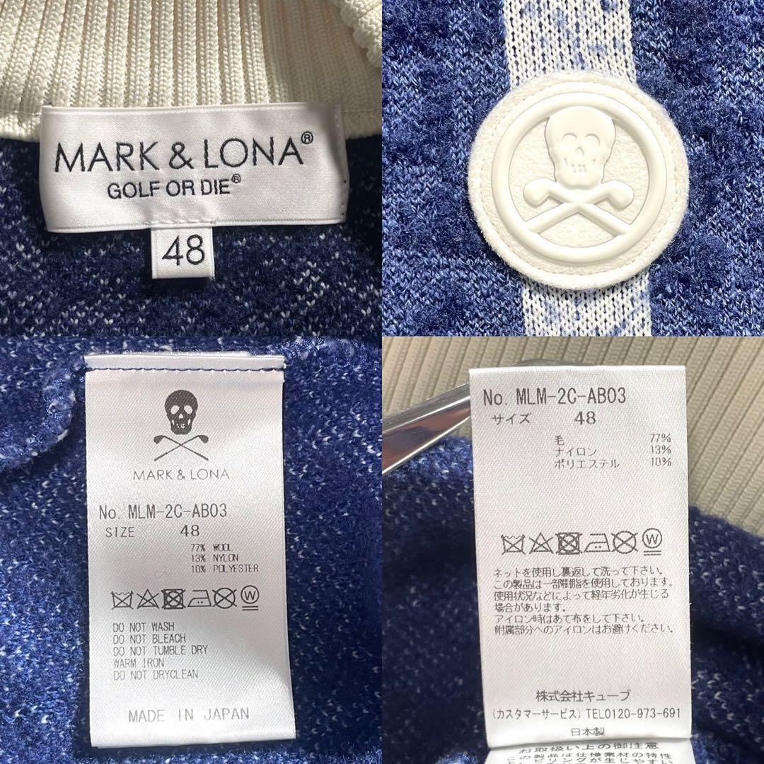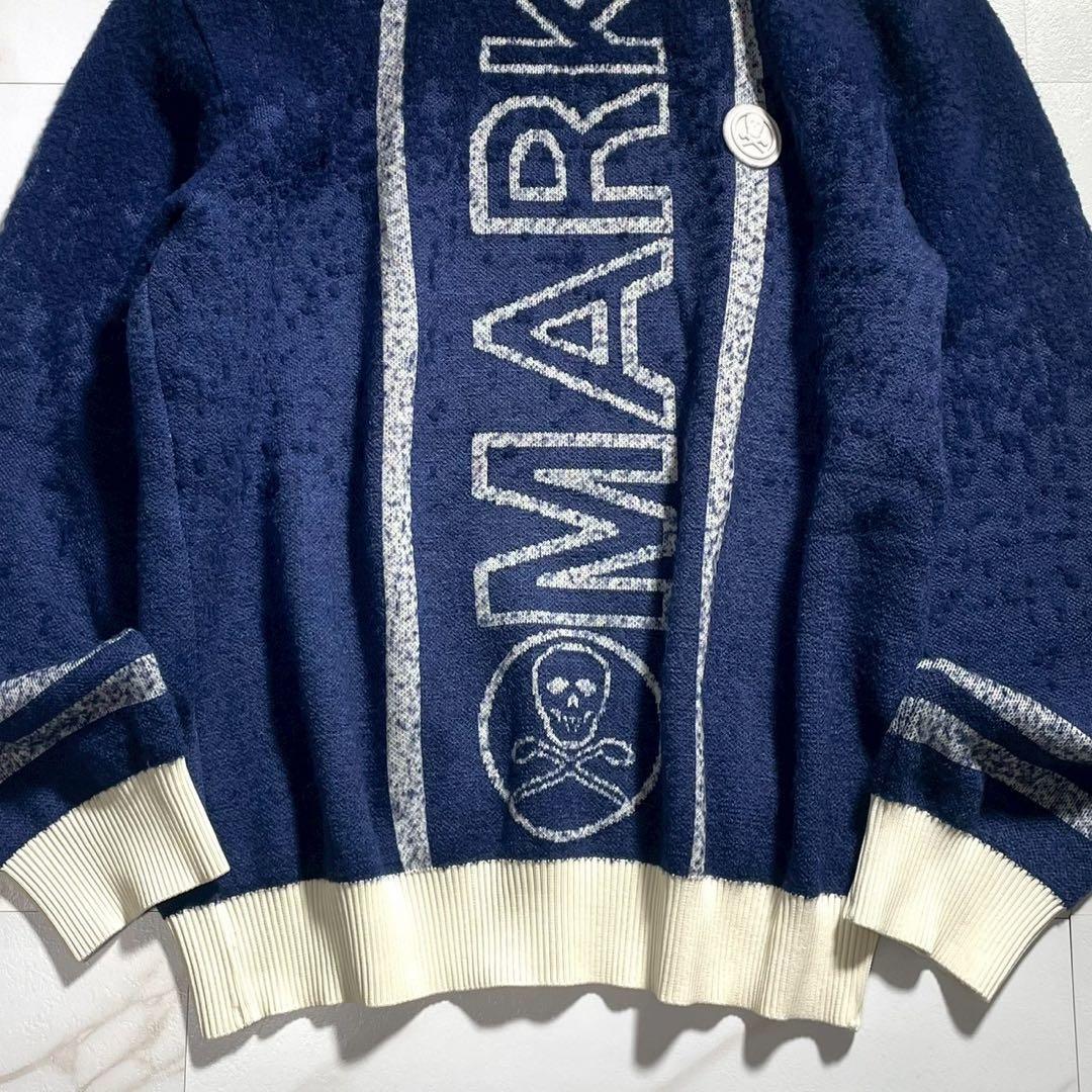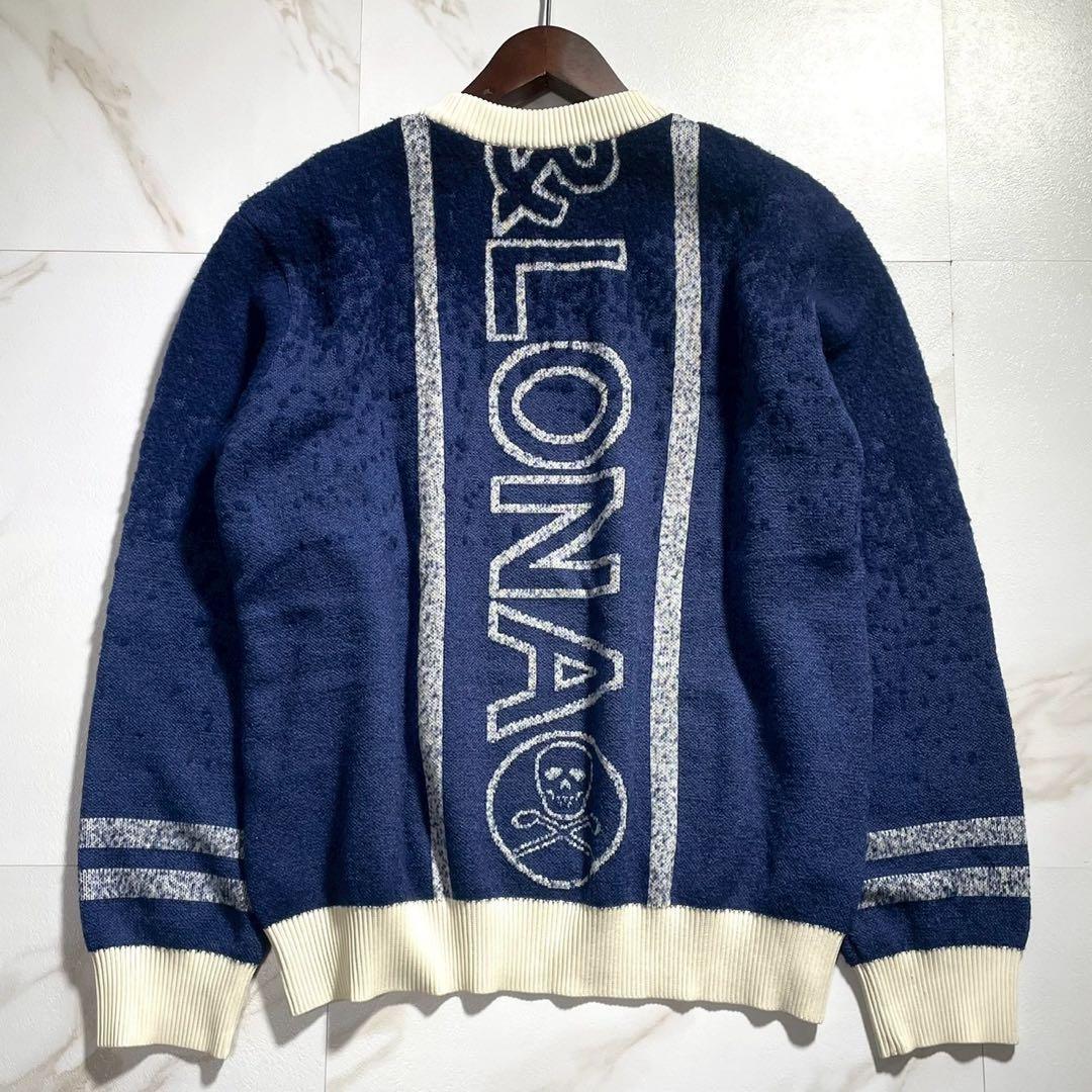 大きくデザインしたボーダーラインがスポーティな印象のプルオーバーニット。前後身頃にサークルスカルとMARK & LONAのロゴをジャカードで大胆に表現しました。左胸にはメタリックなホワイトカラーのサークルスカルワッペンがキラリと輝きます。