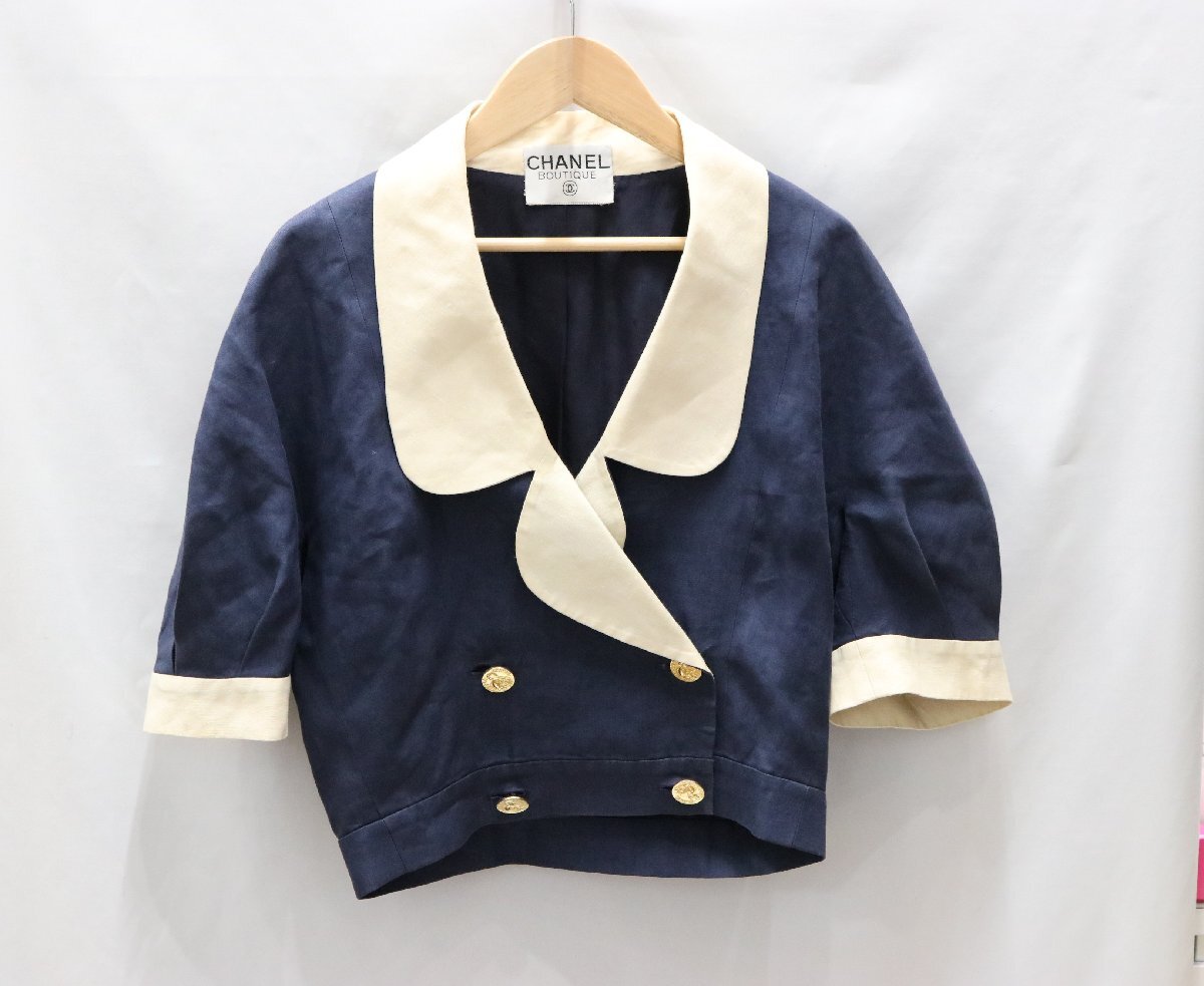 | CHANEL シャネル リネンダブルジャケット ノースリーブワンピース セットアップ 金ボタン ネイビー×ホワイト タグカット | ||