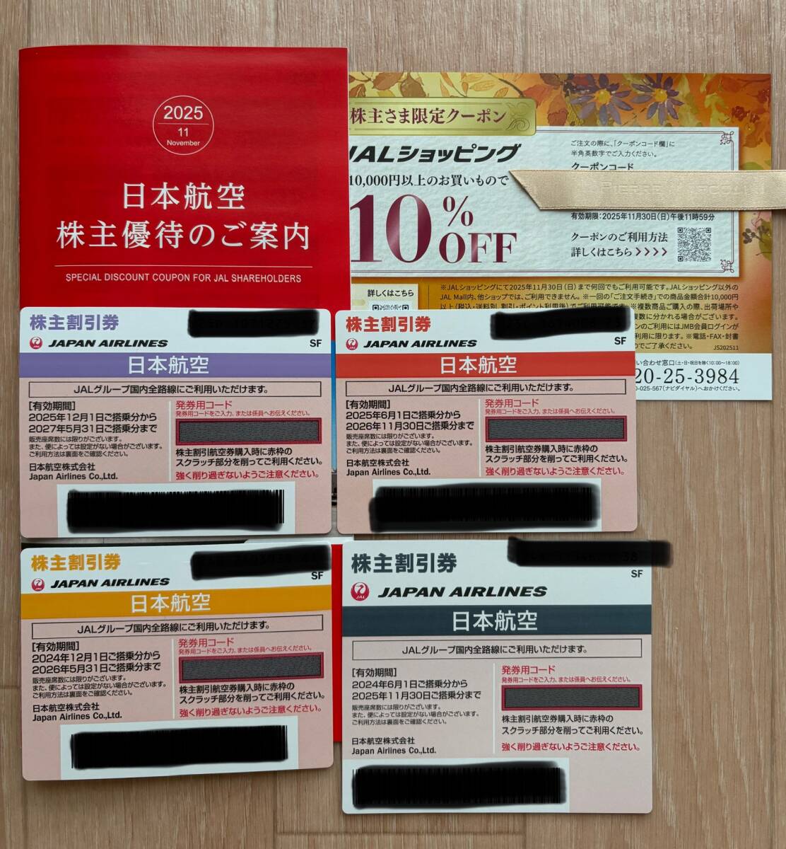 2025年11月30日、2026年5月31日、2026年11月30日、2027年5月31日まで使用可能なJAL(日本航空)株主割引券 各1枚と案内冊子等になります。