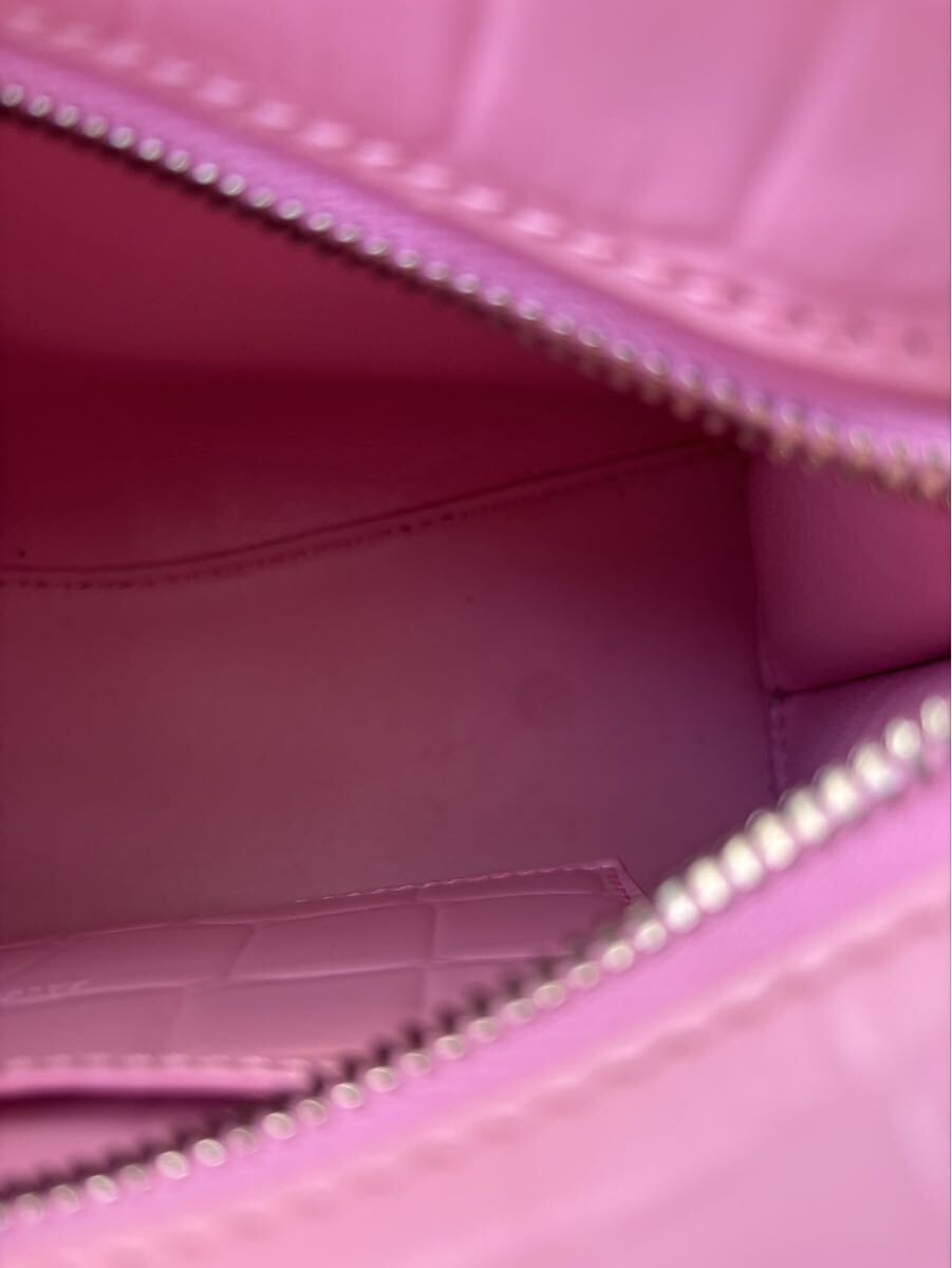 型押しレザーで、カラーはピンクです。ショルダー付きで斜め掛けできます。