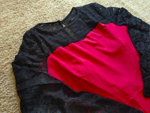 赤のサテン生地が鮮やかなAラインドレス。長袖の黒レースと腰の黒リボンがアクセントになっています。