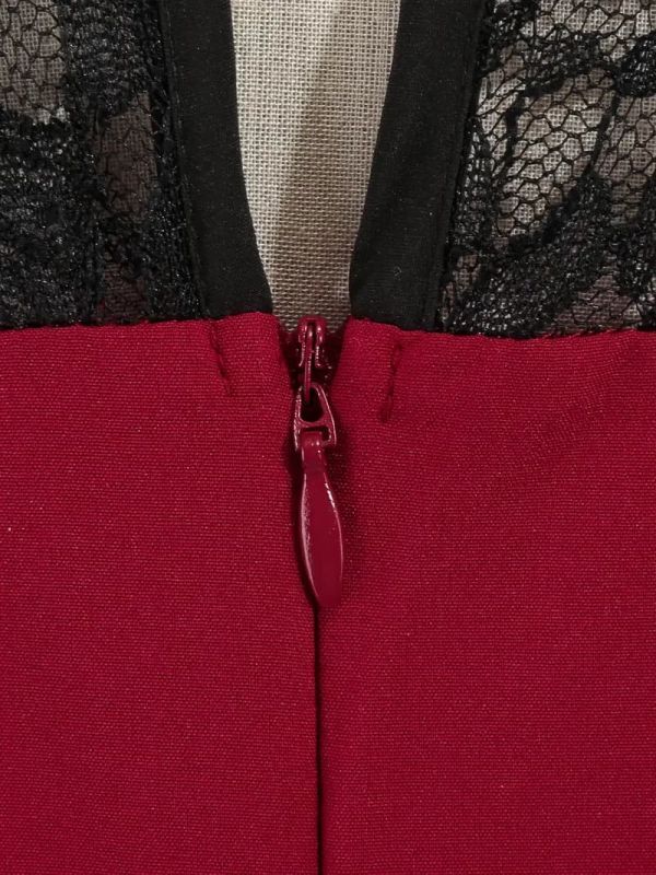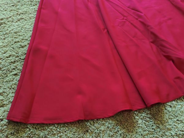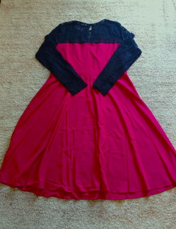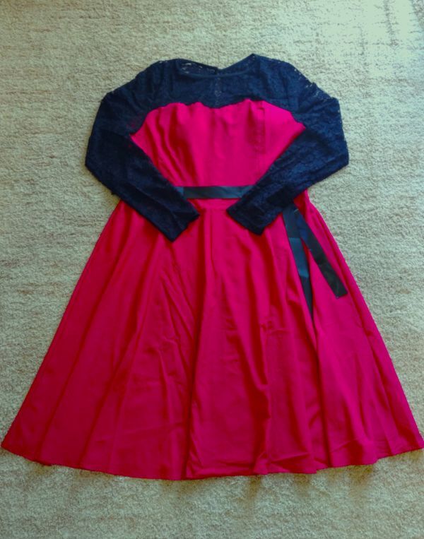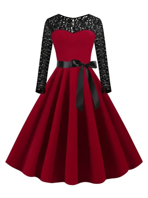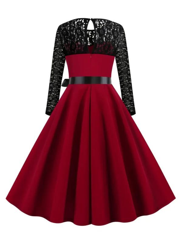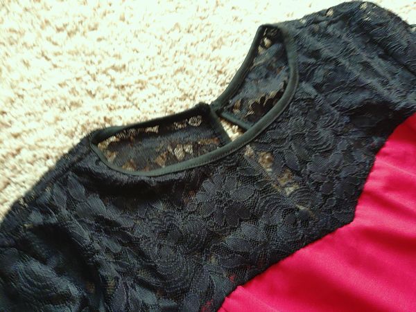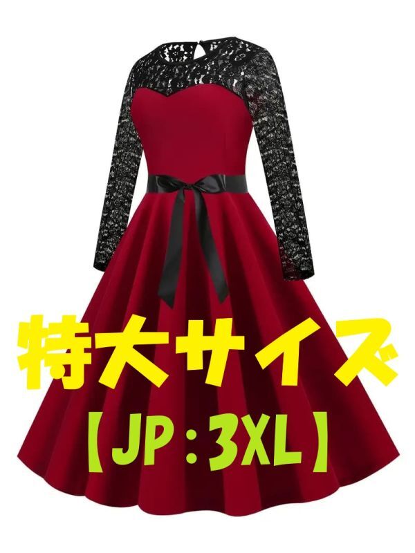 新着★特大★ 赤いサテン生地と黒レース(長袖)&腰リボン Aラインドレス (JP:3XL) [パーティー/フォーマル/イベント/大きい/衣装]