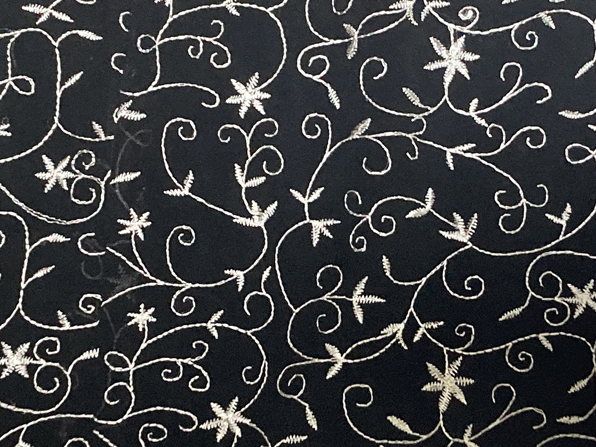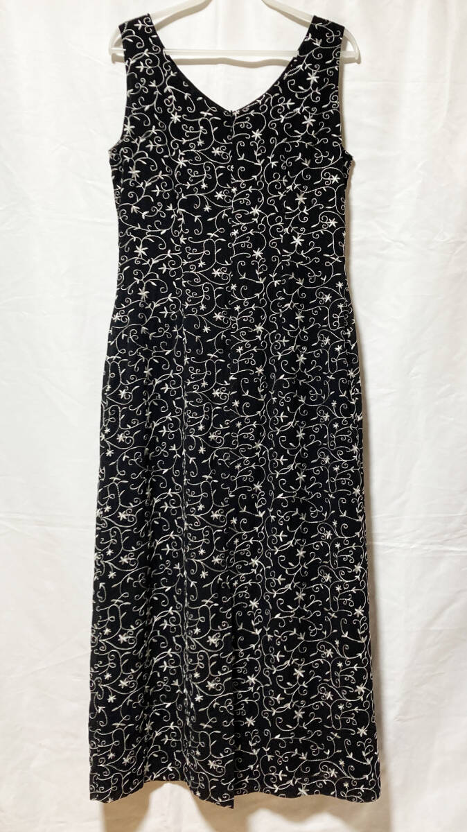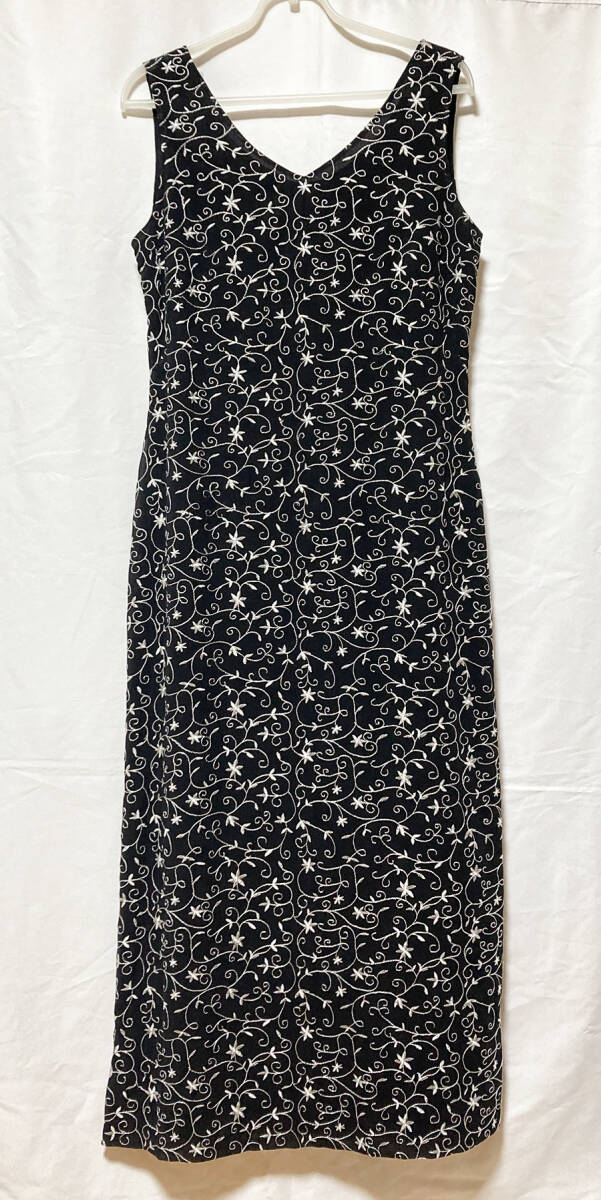 黒の生地に銀の糸で刺繍を施したノースリーブロングワンピースです。