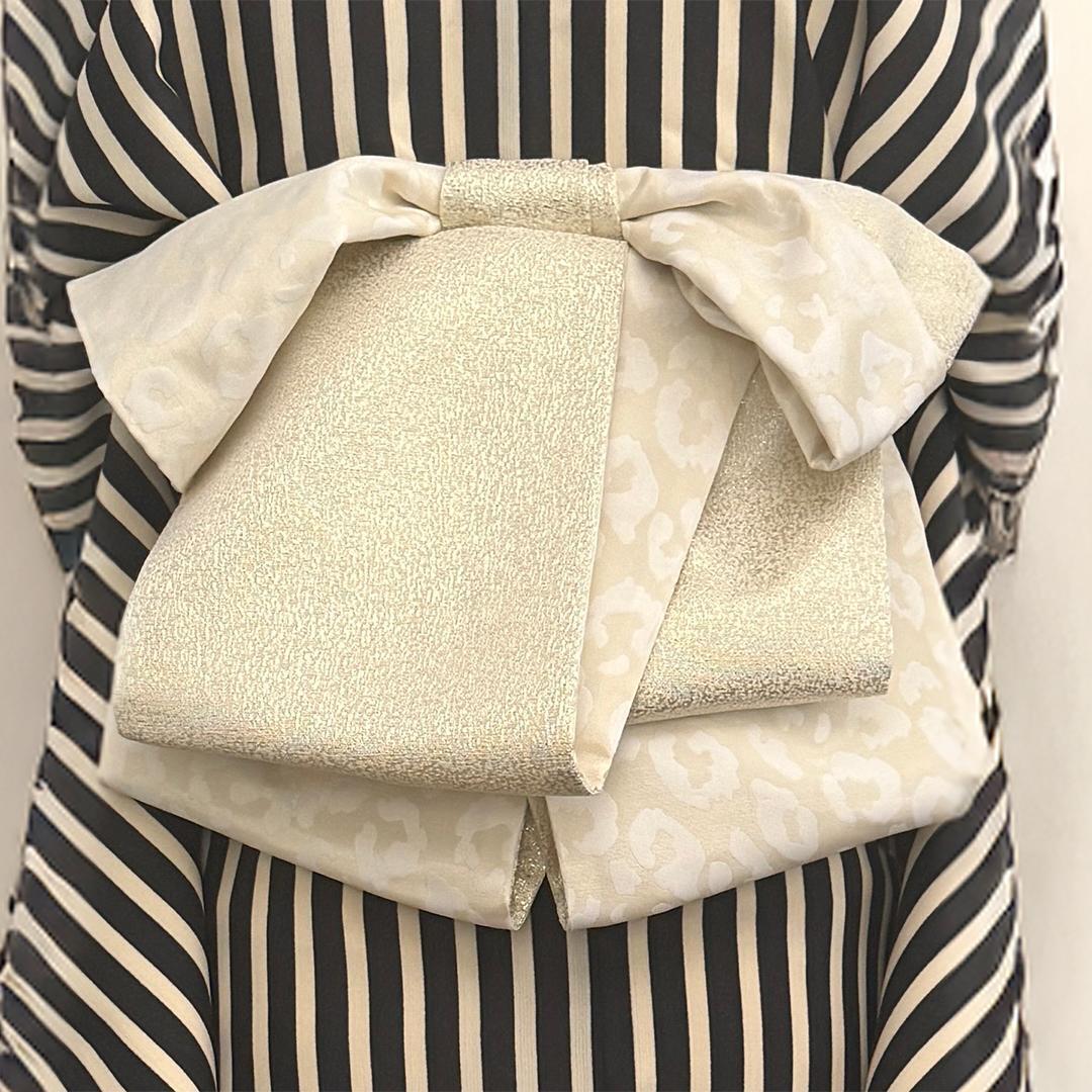 ミルク色のヒョウ柄とミルキーなグリッター(ラメ)、二つの顔を持つリバーシブル仕様の帯です。