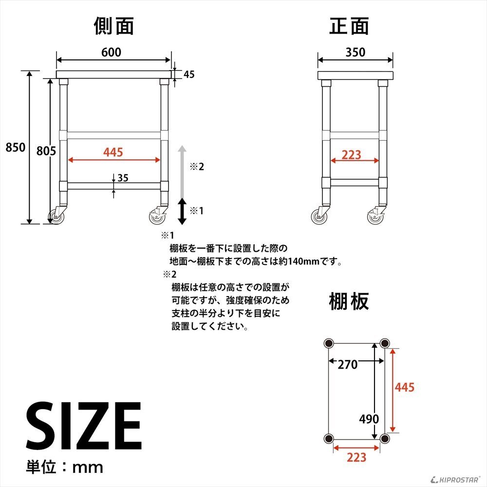 | 材質 | 天板:ステンレスSUS430 脚:ステンレスSUS201 梁:スチール 車輪:PU 軸受:スチール亜鉛メッキ |