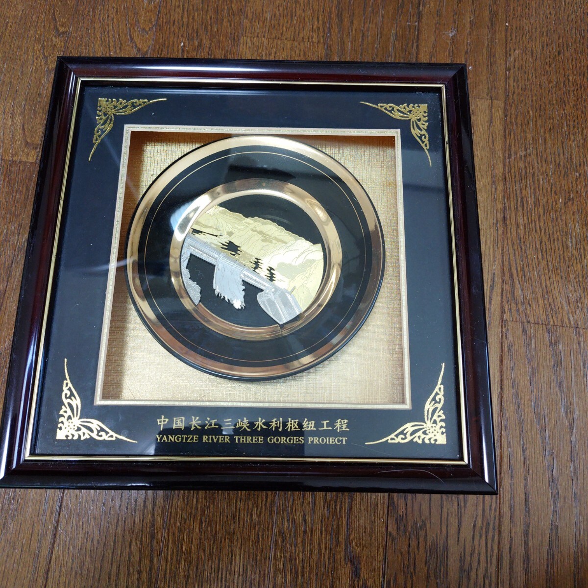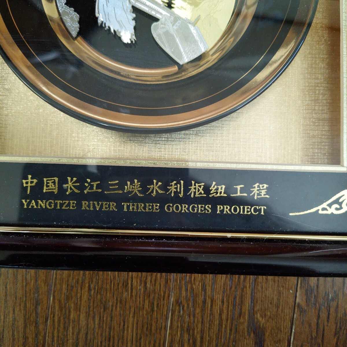 金と銀の装飾が施された美しいプレート、長江三峡プロジェクトをテーマにしたアート作品です。