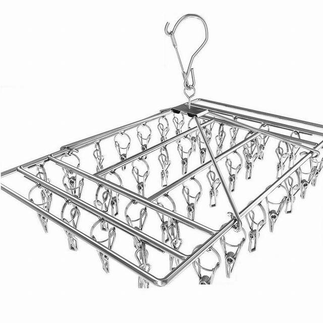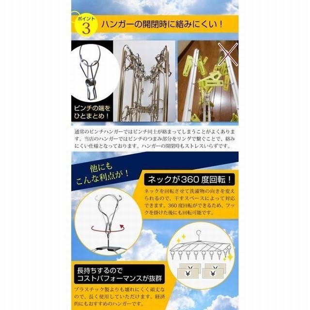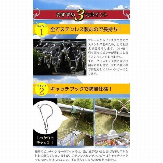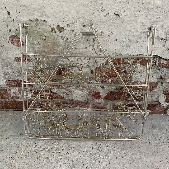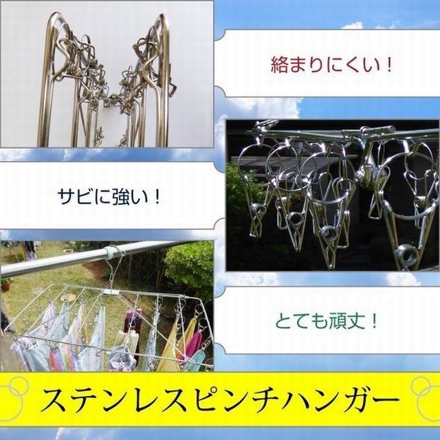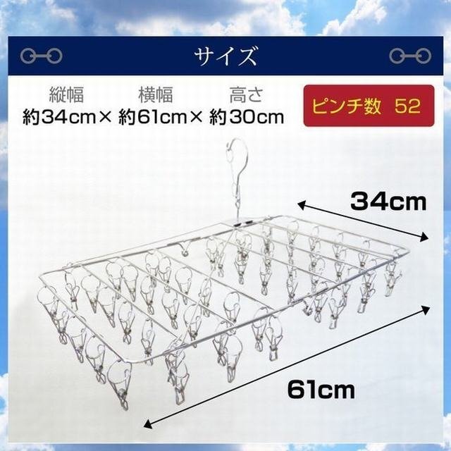 商品詳細 使用時サイズ:約 縦幅34cm×横幅61cm×高さ30cm 折りたたみ時サイズ:約 縦幅30.5cm×横幅34cm×高さ(厚さ)5cm 材質:ステンレス 特徴: 全てステンレス製なので長持ち! キャッチフックで防風仕様! ハンガーの開閉時に絡みにくい!