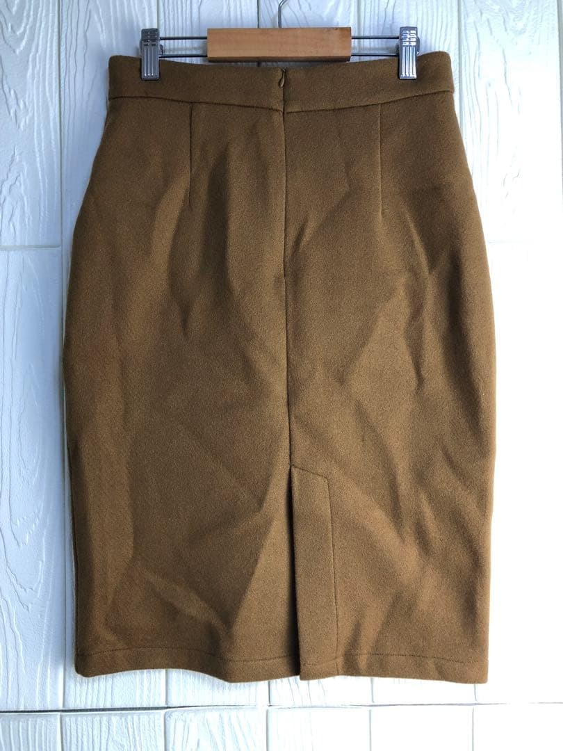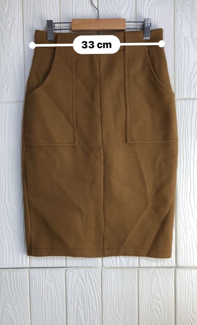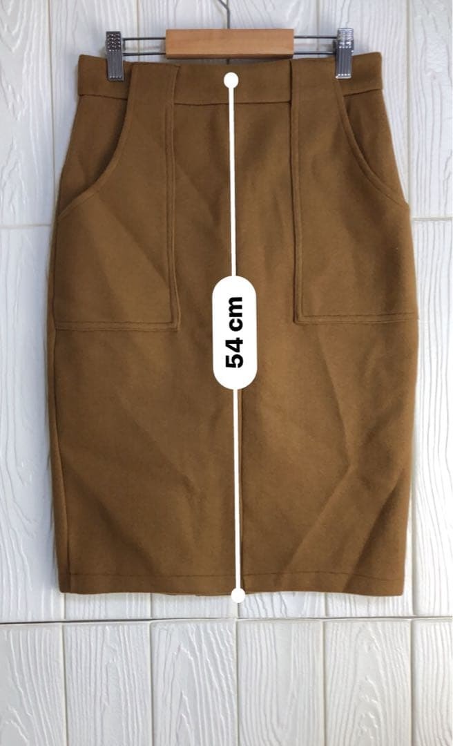 シンプルなブラウンのタイトスカート、54cmの丈と66cmのウエストサイズで、スタイリッシュなデザインが特徴です。