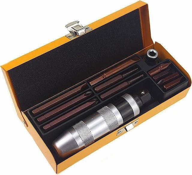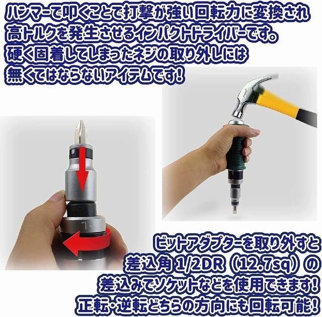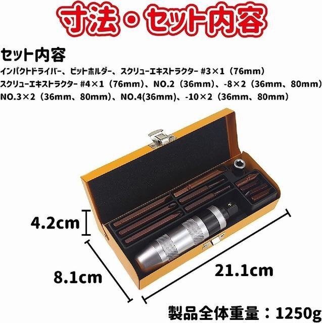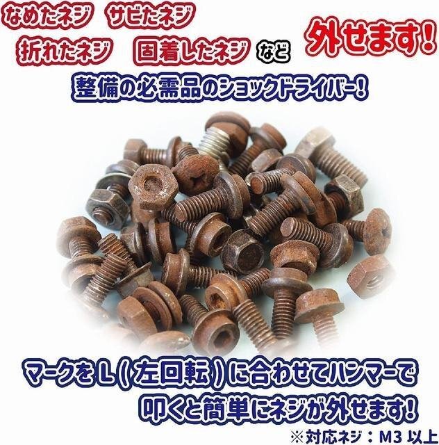 【使用用途】 なめたネジ、折れたネジ、サビたネジ、固着したネジなど外せます。 整備の必需品のショックドライバーです。 マークをL (左回転) に合わせてハンマーで叩くと簡単にネジが外せます。 対応ネジ:M3以上 【サイズ】:掲載サイズ表をご参照ください 【高品質素材】 ビットに使用されているS2合金鋼の硬度は60HRC、S2工具鋼は耐久性、衝撃?振動耐性に優れています。錆びて固着したネジなどに非常に有効です。 【潰れたネジ対応可能】スクリューエキストラクターが二本付き。折れた、錆び付いた、なめたネジに対応できます。