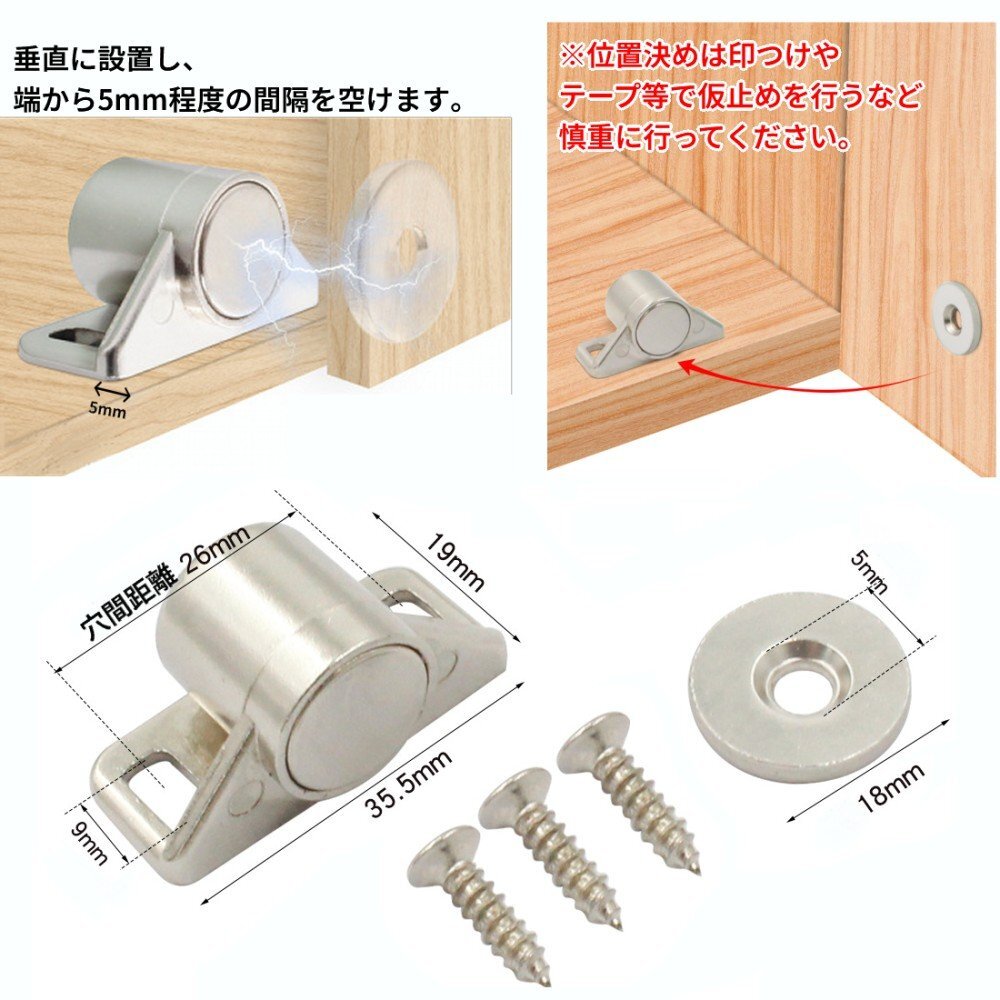 【マグネットキャッチ】 強力な吸引力のマグネットで、吸着力は強く、家具などのドアをしっかりと固定します。 一体型ベース、繊細な金属のアンティークな質感で周りのデザインに影響を与えません。 【取付簡単】 楕円形の調整穴により、本体の前後位置を微調整でき、ネジで固定するだけで簡単に取り付けが出来ます。 【高耐久素材】 亜鉛合金素材、細かい研磨面、滑らかな表面を維持するための電気メッキ処理。 耐久性があり、防錆、耐腐食性、耐摩耗性に優れています。 【様々に適応】 幅広い使用範囲で、タンス、ドア、扉、クローゼット、引き出し、家具、DIYラックなどに最適です。 ※取り付け箇所には穴を開ける必要がございます。 ※位置決めは印つけやテープ等で仮止めを行うなど慎重に行ってください。 ※輸入品の為、取扱説明書は付属しておりません。 ※一部の仕様やデザインは予告なく変更になる場合がございます。 |
