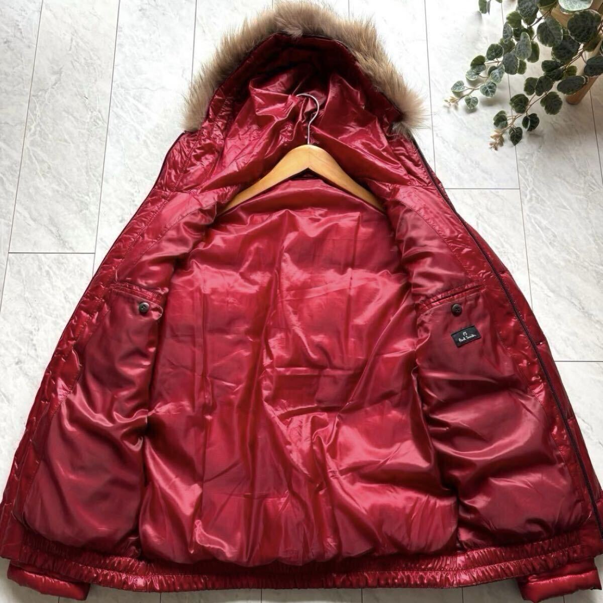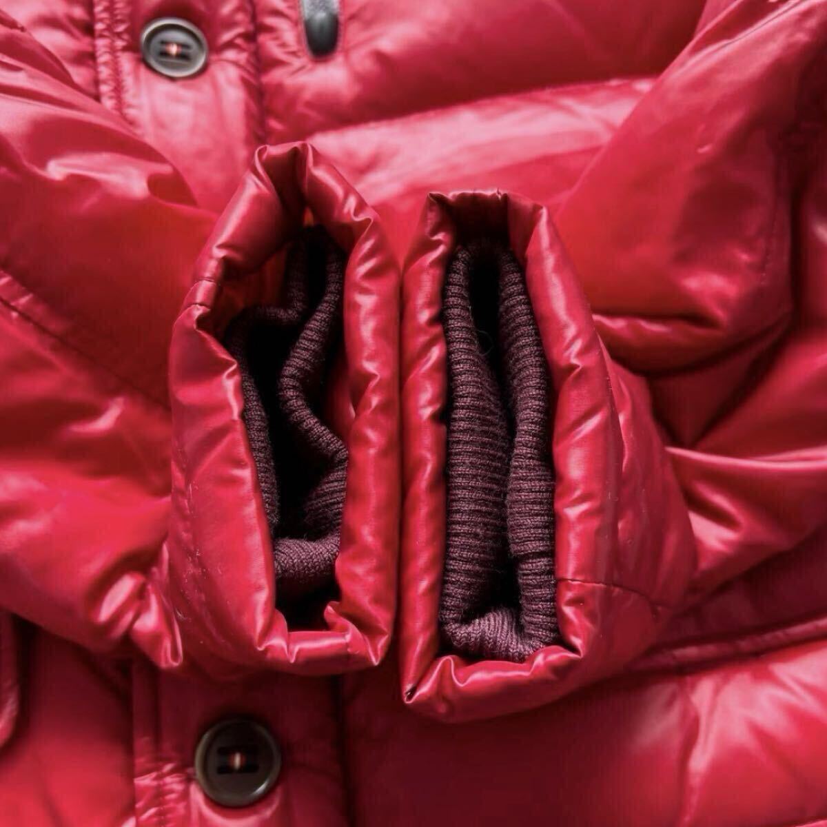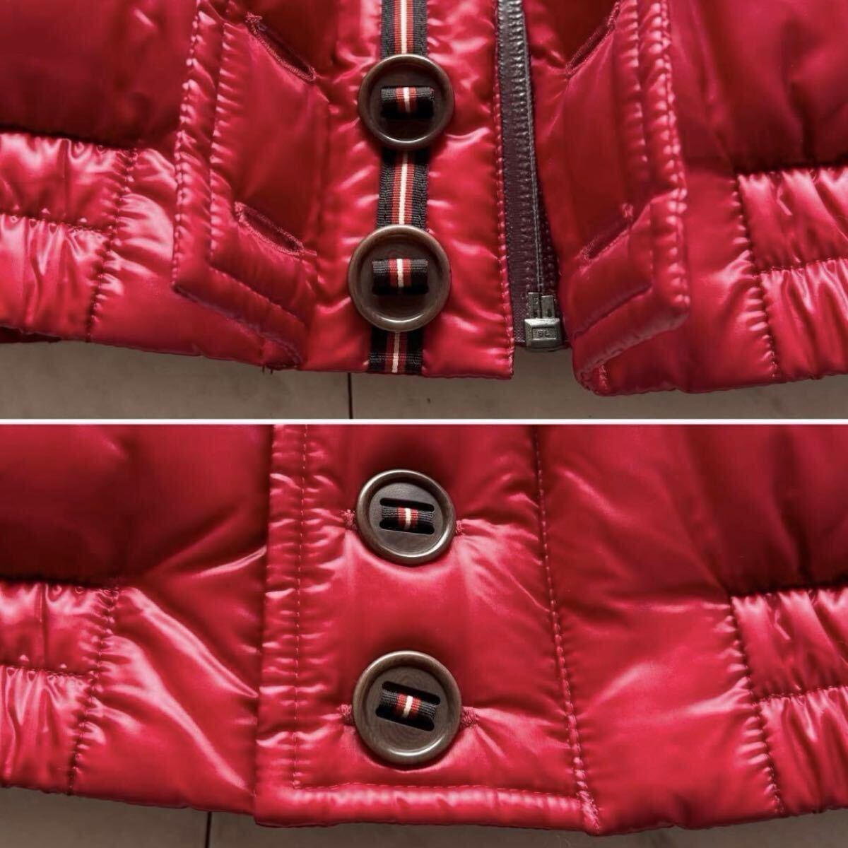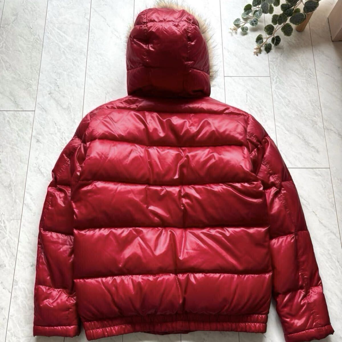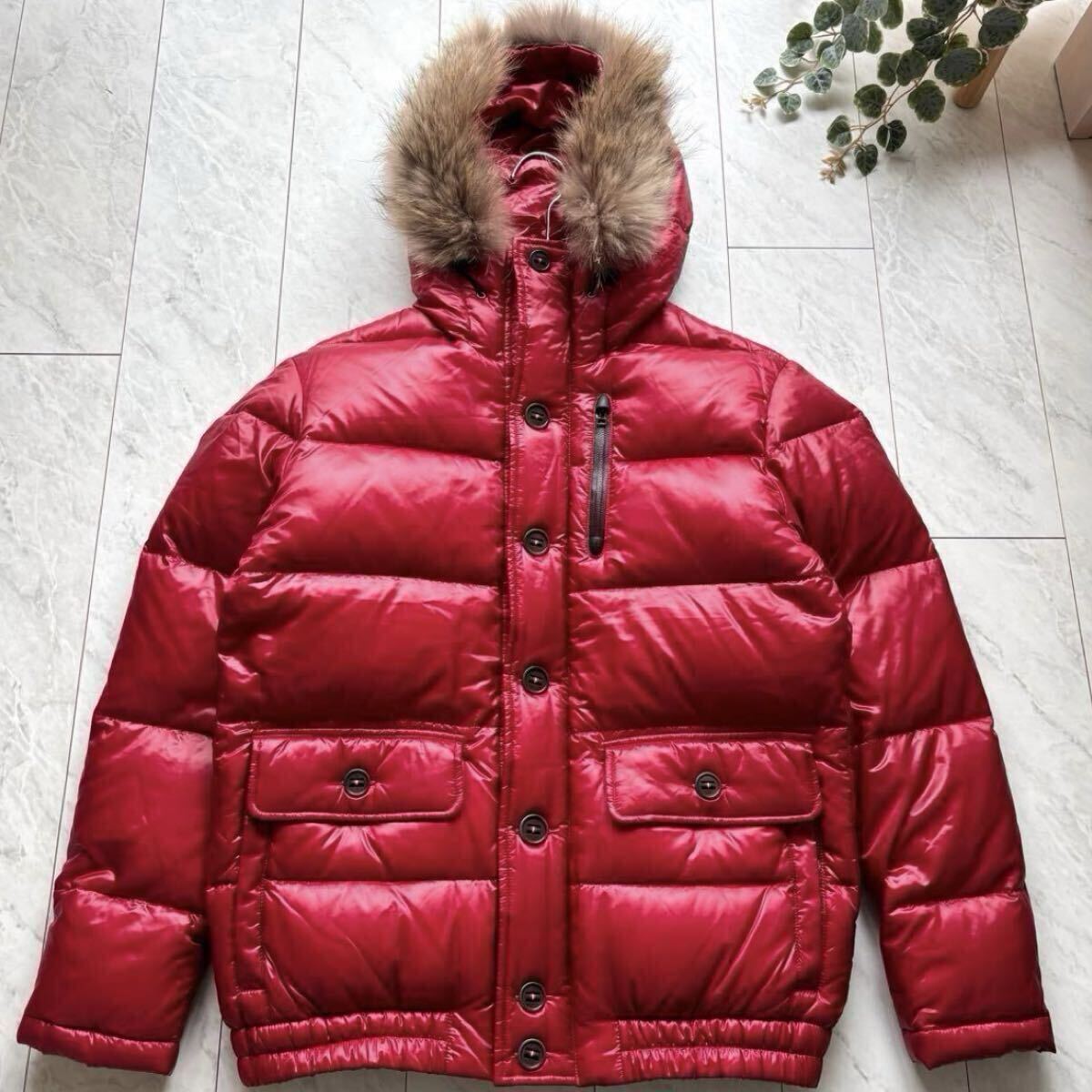 鮮やかなレッドカラーがオシャレなダウンジャケットです。フードのファーのみ着脱可能です。