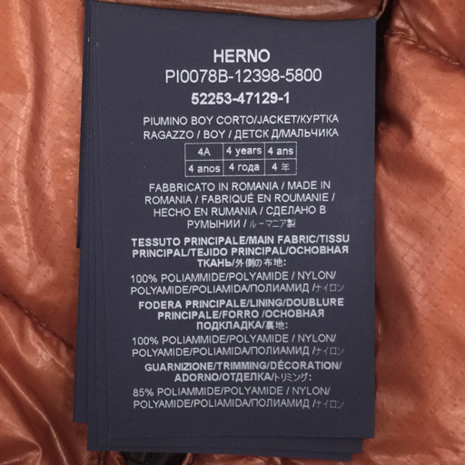 | 新品同様 ヘルノ サイズ 4A 約105cm ジップアップ ダウンジャケット PI0078B 子供服 オレンジブラウン系 タグ付き |