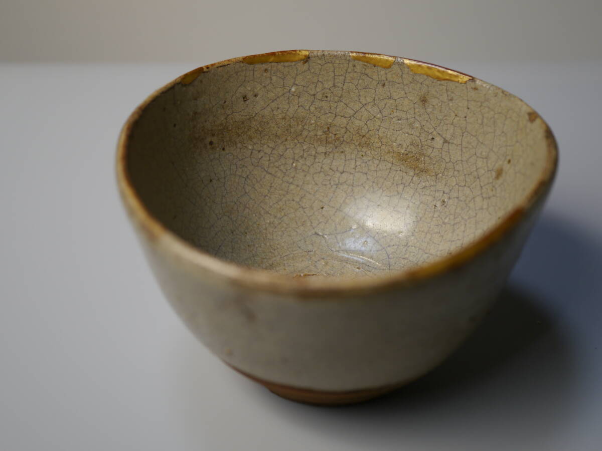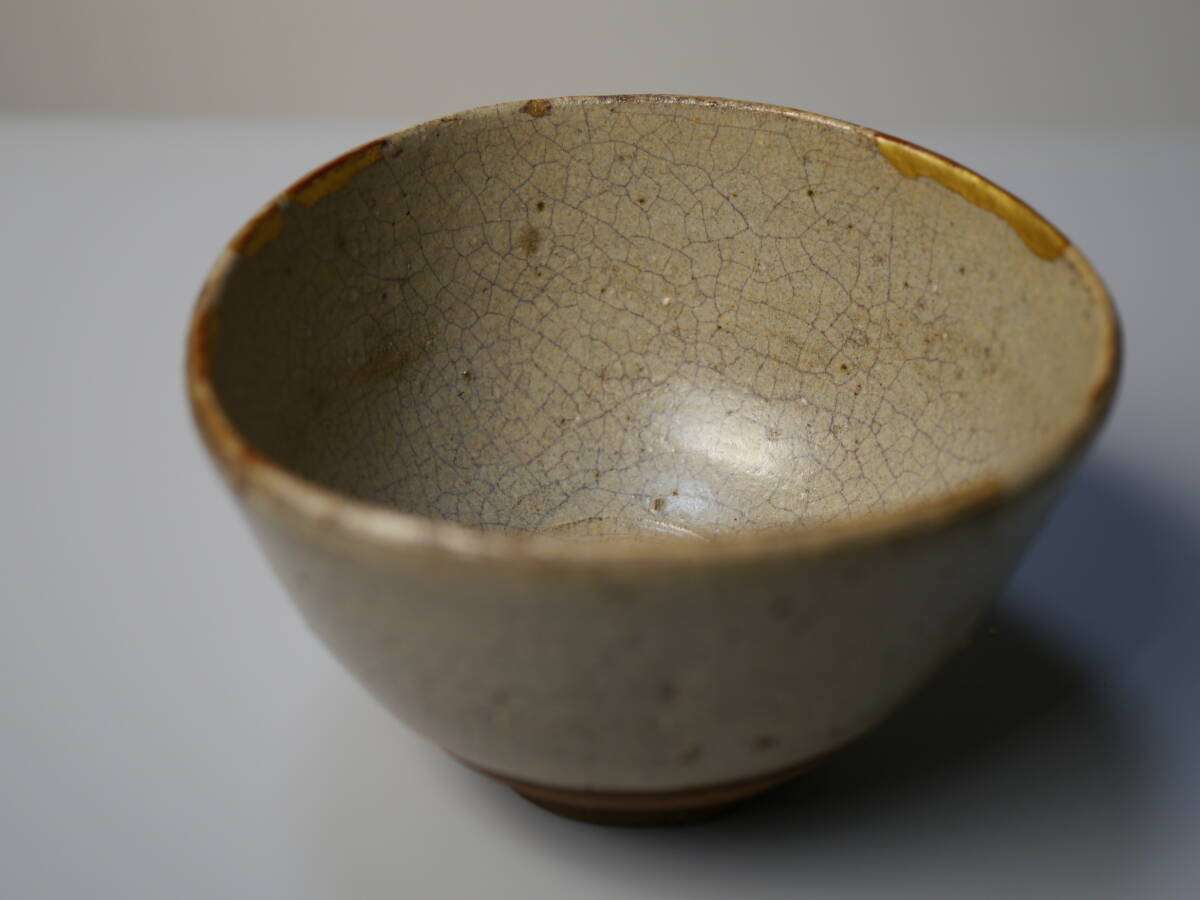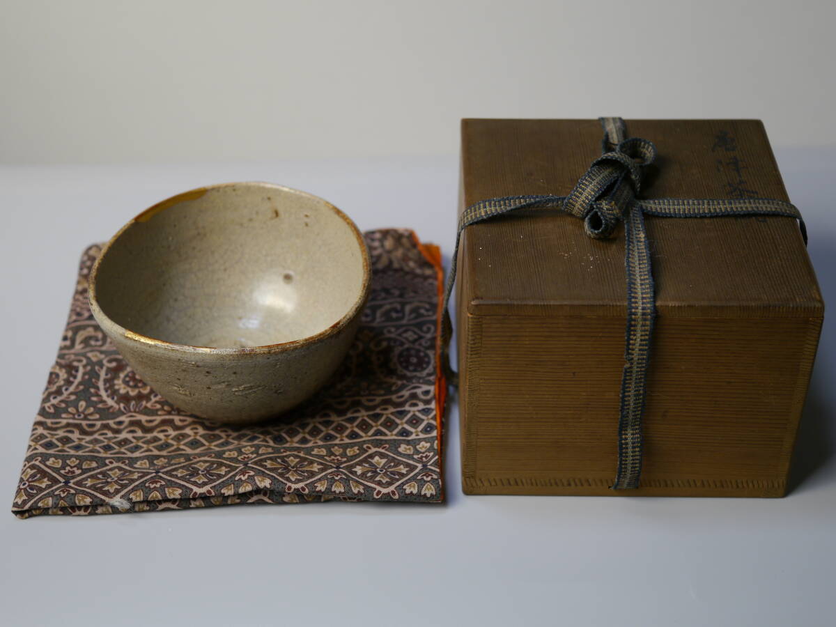 口縁にほつれの金直しがあります。形、サイズ、土味、釉調共に古唐津茶碗の教科書のような茶碗です。細かな柾目の上手時代杉箱とともに敷布も付けます。