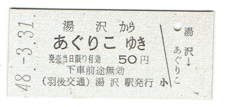 | 《硬券 乗車券》羽後交通 湯沢からあぐりこゆき 昭和48年 | |