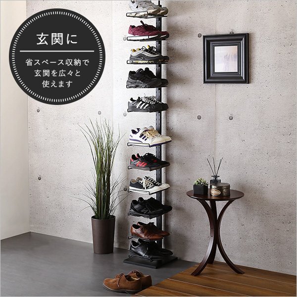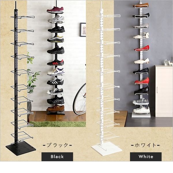 見せる収納の突っ張りシューズラック11段 お気に入りの靴を飾るディスプレイラックとしても、靴を収納するためのシューズラックとしてもお使いいただけます。 棚の高さ調節が可能なので、ハイカットやロングブーツでも容易に収納ができて便利です。 |