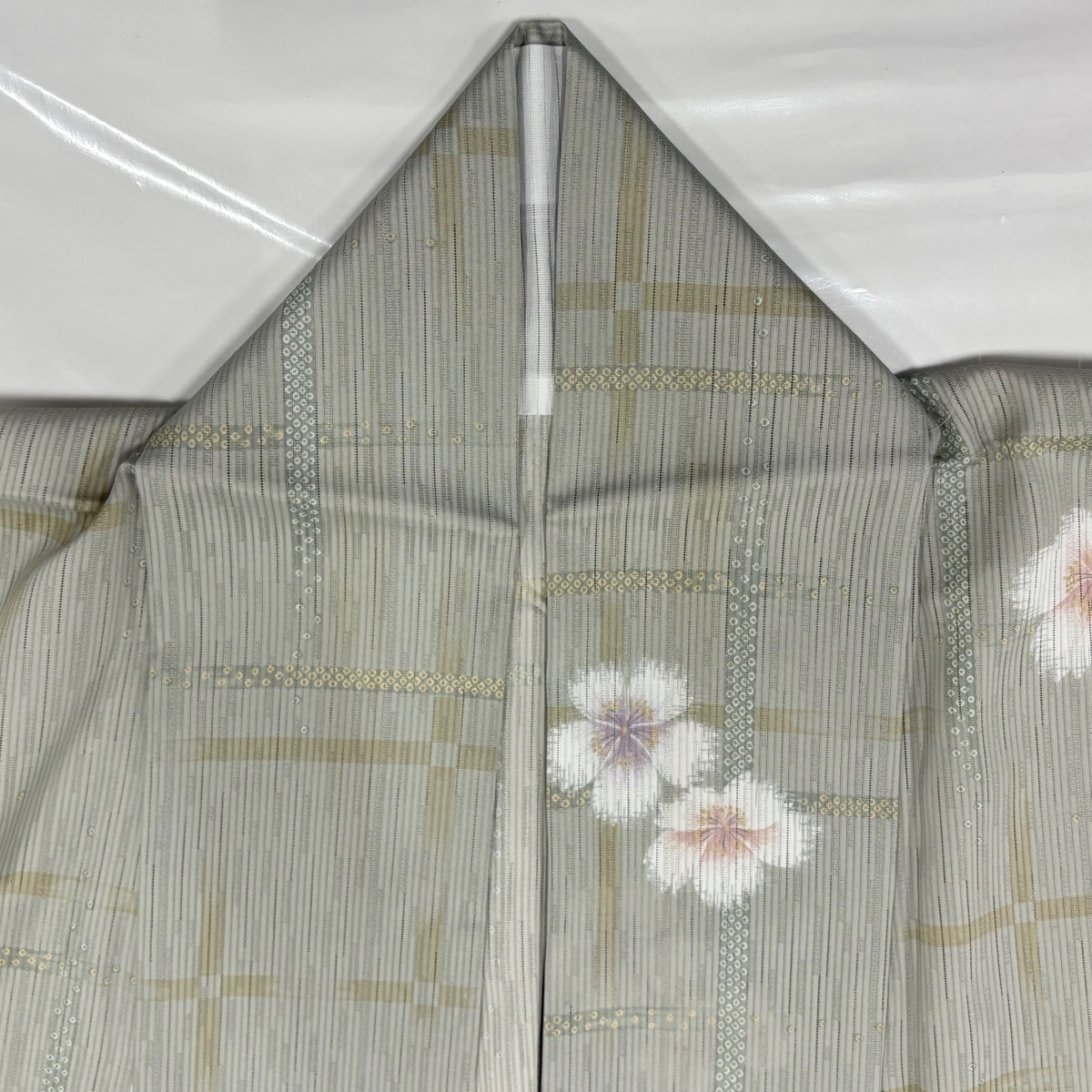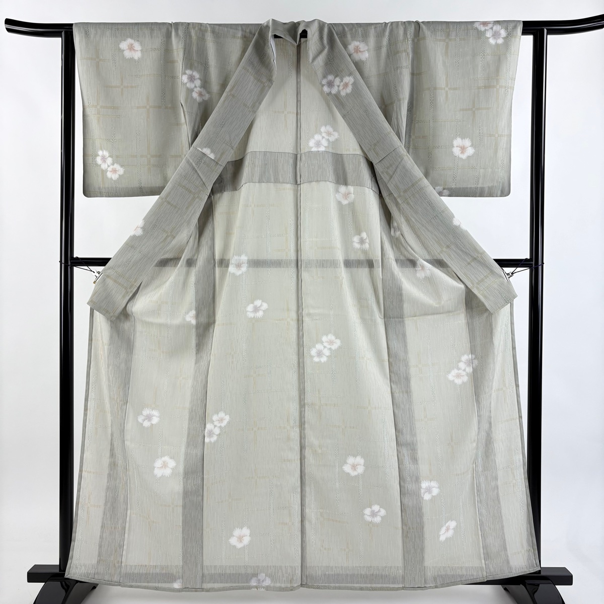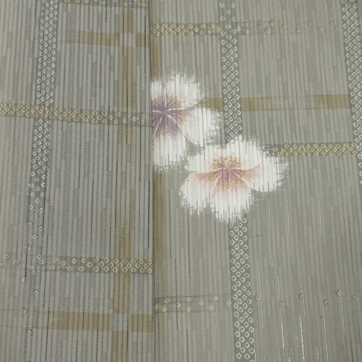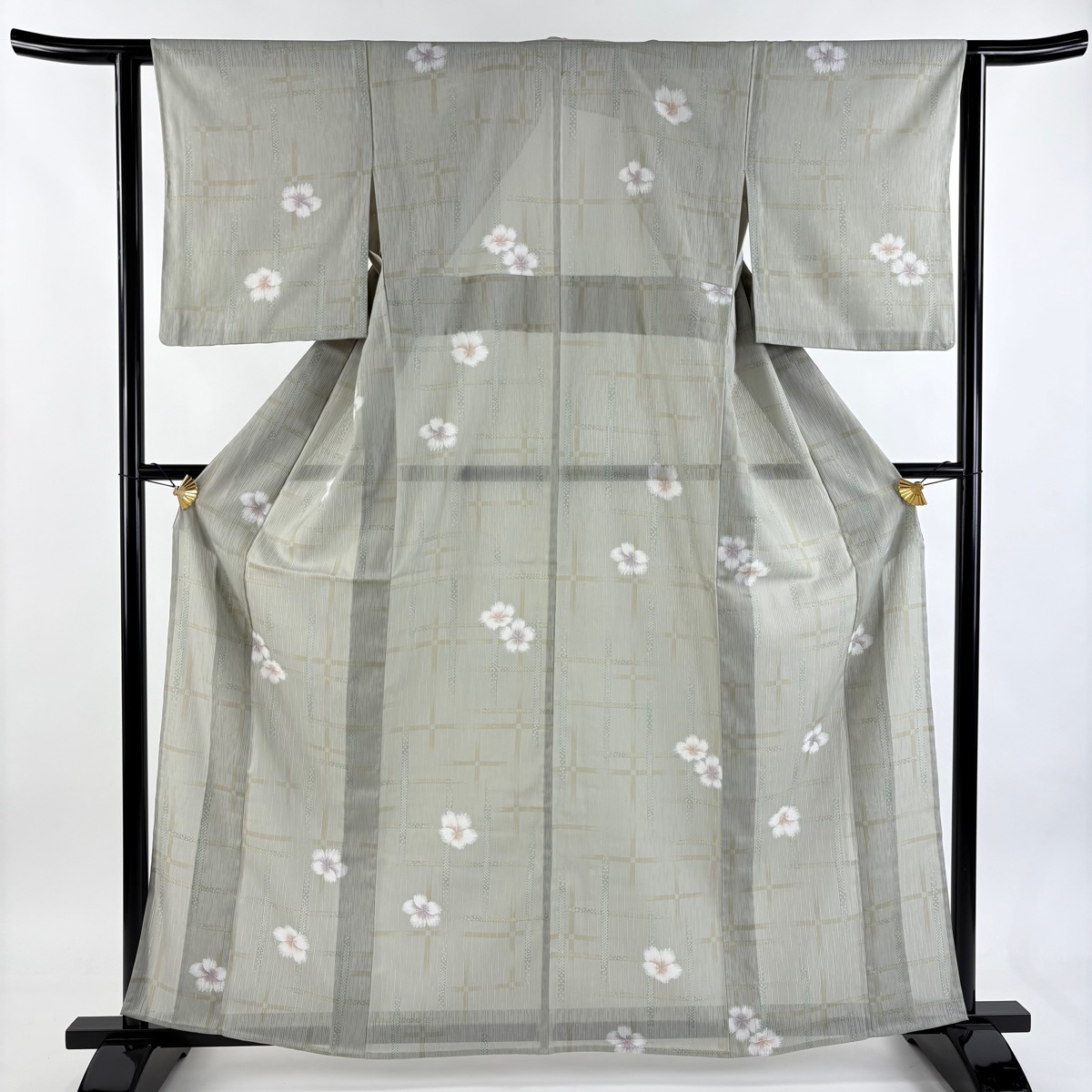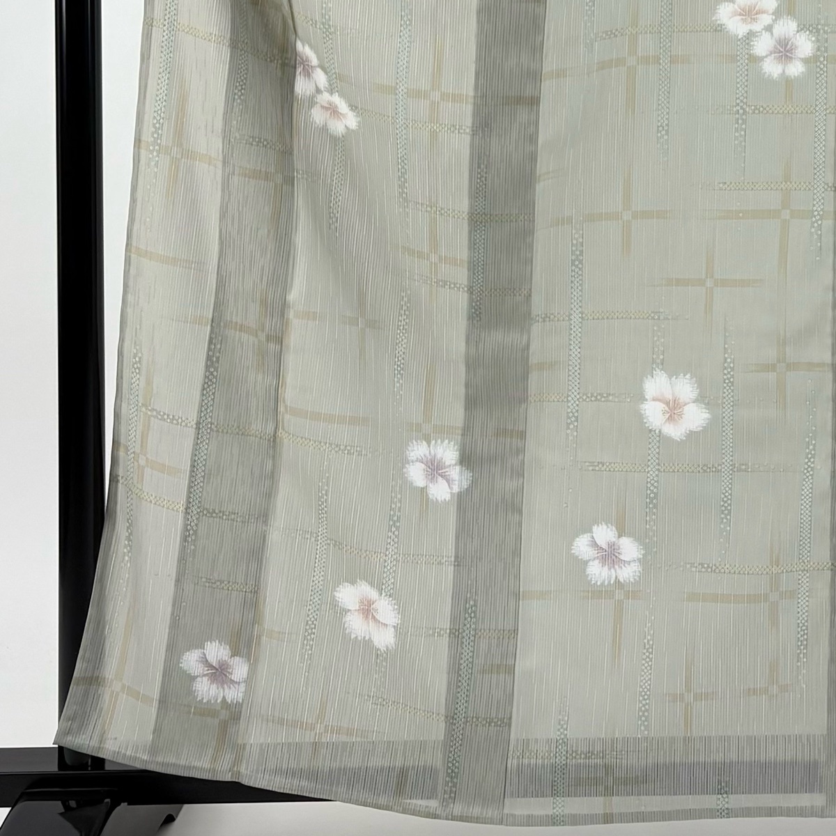 | 小紋 秀品 花 格子 灰緑 薄物 身丈161.5 裄丈61.5 S 正絹 【中古】 |