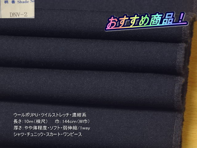 ウールポリPU ツイルストレッチ やや薄 ソフト 濃紺系 10mW巾