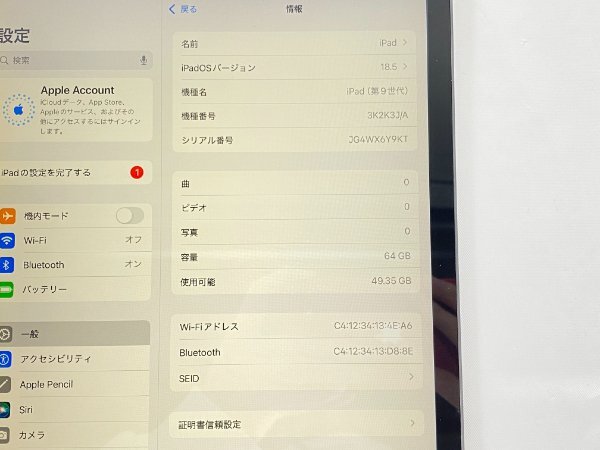 ご覧いただきましてありがとうございます。 【商品名】iPad 第9世代 Wi-Fiモデル 64GB 【型番】3K2K3J/A 【カラー】スペースグレイ 【iOSバージョン】18.5 【ストレージ】64GB 【ネットワーク利用制限】〇 【アクティベーションロック解除の有無】解除済 【付属品】箱 説明書 充電器 充電ケーブル 【商品の状態】目立った傷や汚れのない商品です 初期化済みです 出品に伴い、外装の簡易清掃済み その他詳しい状態は写真にて判断をお願いします。 また、こちらは中古品ですのでバッテリーの持ち、劣化に関する返品は致しかねますので予めご了承ください。 | |||
