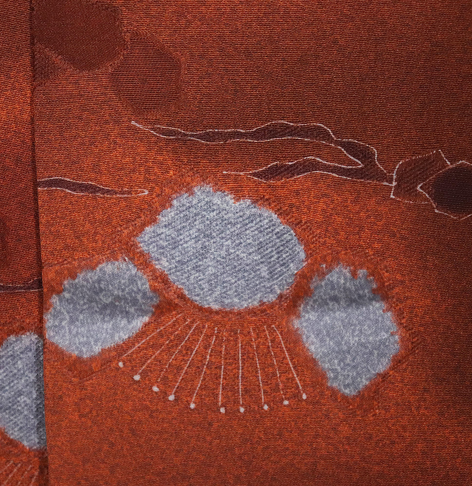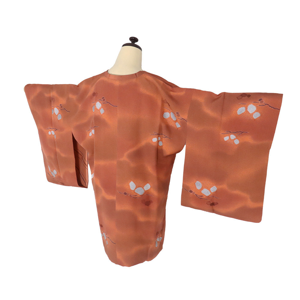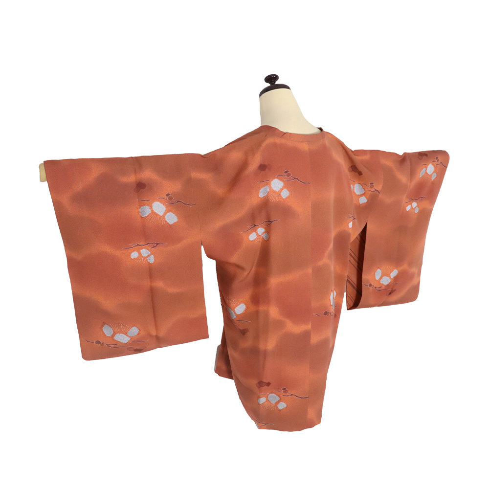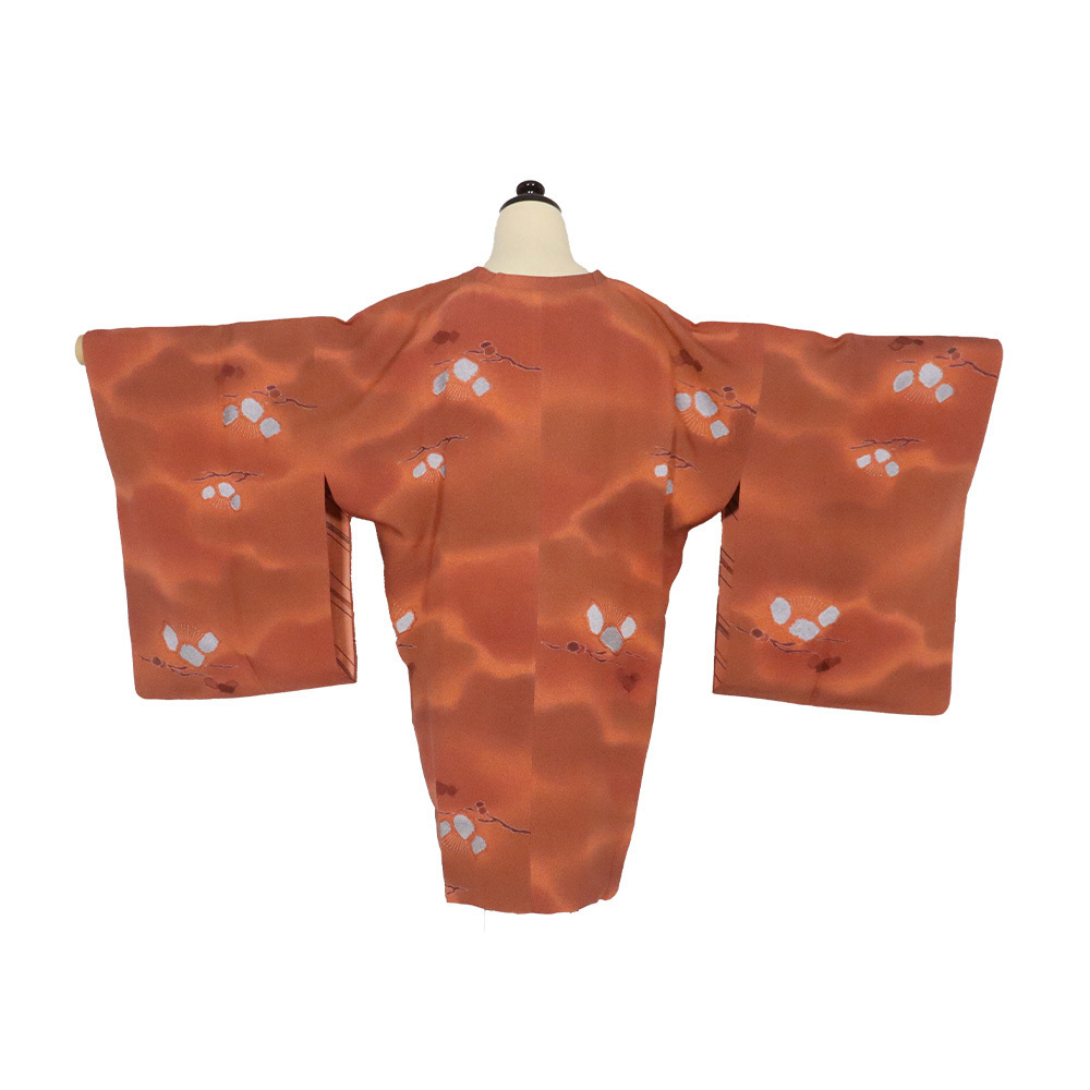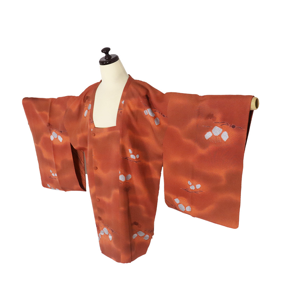 | 色・柄 | 秋・冬用 和装コート ト 道行コート 袷 赤茶・橙色・暈し地 一部絞り・松 (写真では上手く色が出ない場合があります。ご了承下さい) |