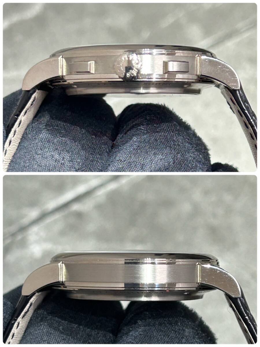 ストラップはブラックダイヤルに合わせたブラックのアリゲーターストラップ、大変引き締まった雰囲気で全体的に美しく高級感があふれるモデルでございます。