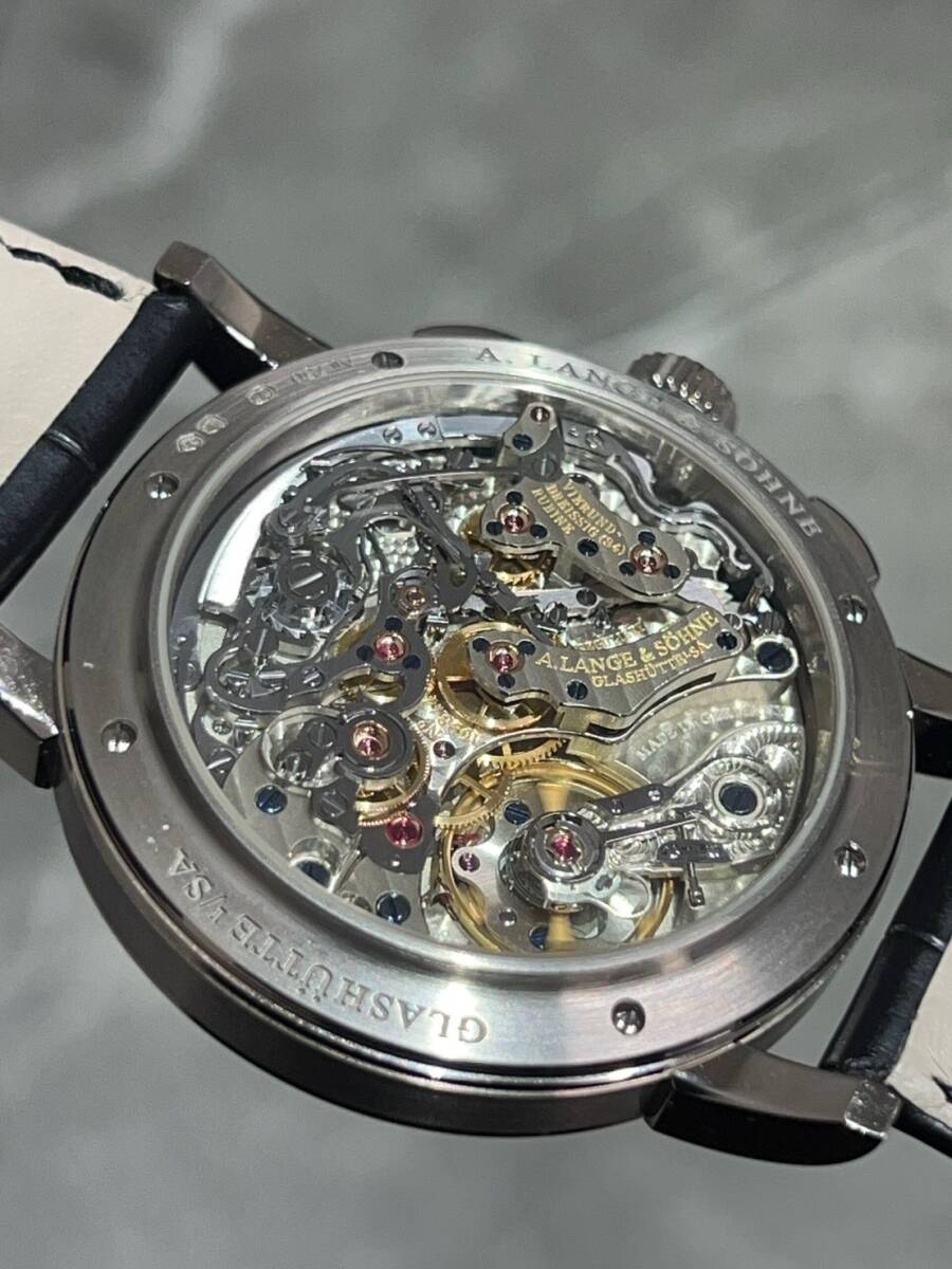 ホワイトゴールドのケースにダイヤル外周に脈拍測定用のルスメーター(脈拍計測用目盛り)がございまして裏蓋からはこれでもかという程美しいキャリバーL951.5がご覧いただけます。
