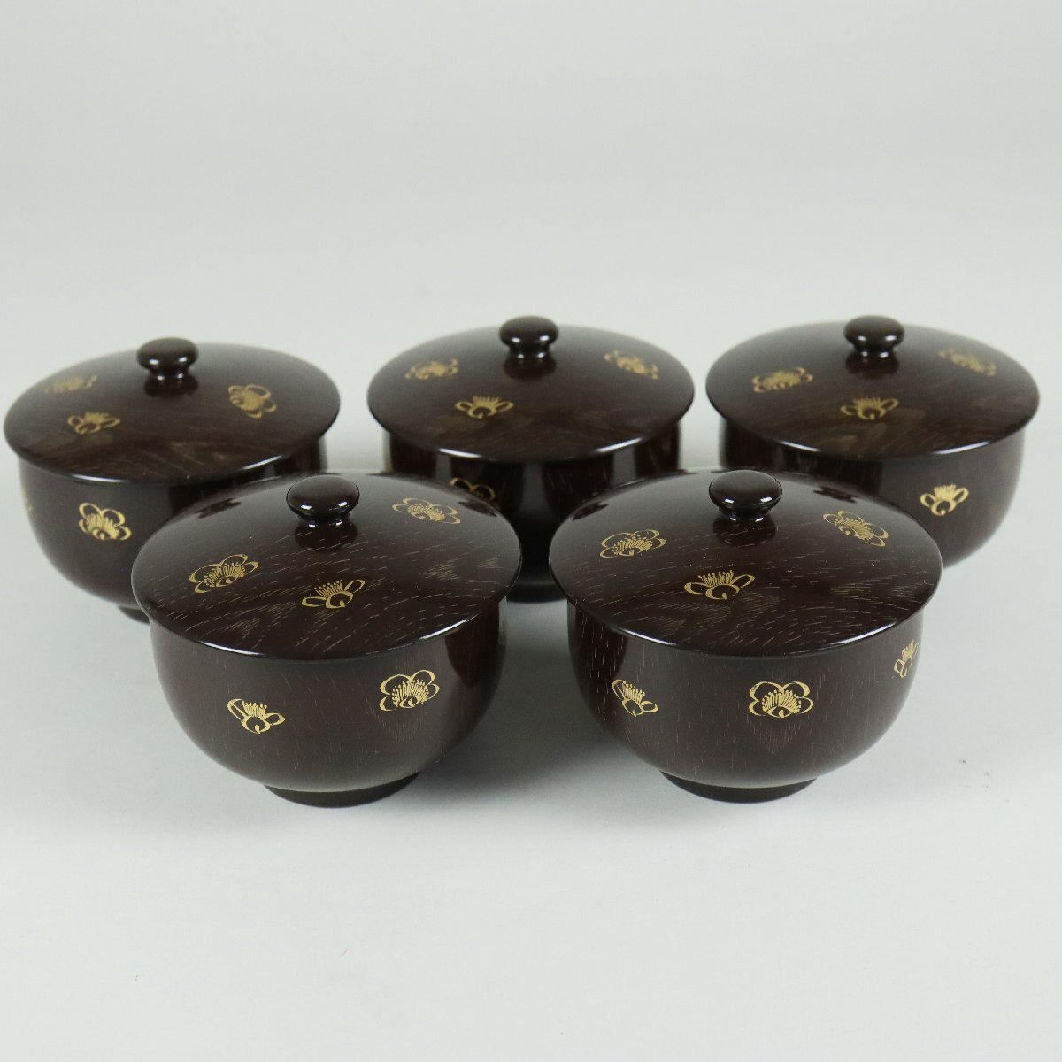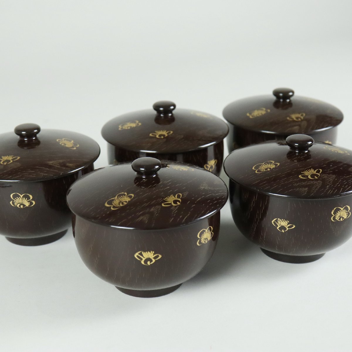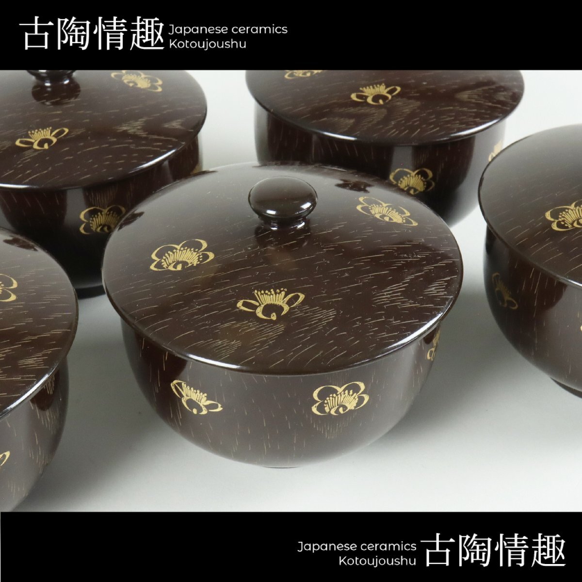 【古陶情趣】現代 天然木本漆 鳥安謹製 梅蒔絵 御湯呑 5客 料亭 懐石 旅館 日本料理 居酒屋 500058wqS