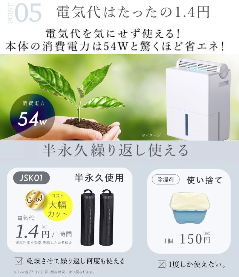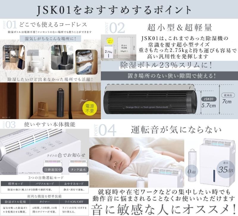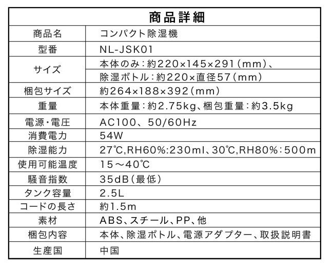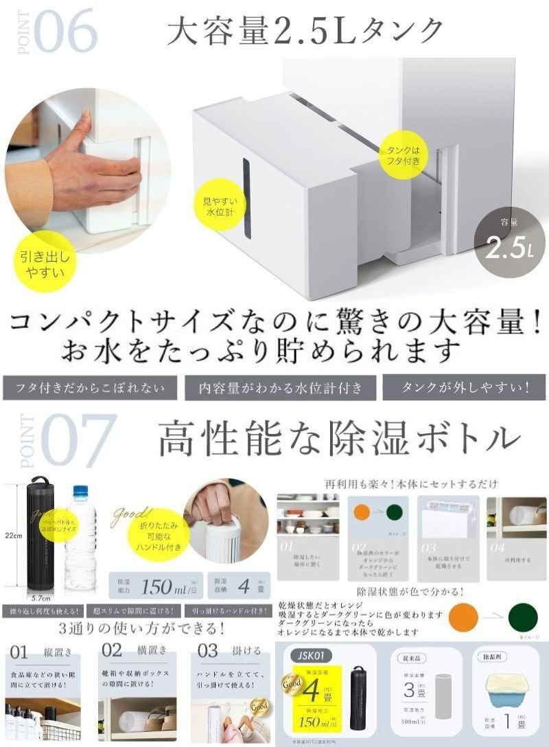 | 商品説明 | いつでも・どこでも・使いたい場所で 4WAYコードレス除湿機 除湿ボトル2本付き! だから3ヶ所同時に除湿可能! 大容量で2.5Lのタンクは蓋付き・水位計付きで使いやすい ■三種類の自動運転モード ■蓋付きタンク ■商品サイズ:〔本体〕約220x145x291(mm)/〔除湿ボトル〕220xΦ57(mm) ■重量:約2.75kg サンプル品のため一部、商品仕様が変わっております。 |