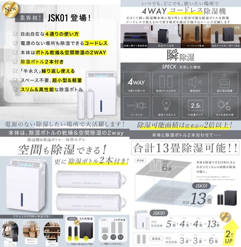 LIV ALL DESIGN 4wayコードレス除湿機 除湿器 小型 2.5Lタンク 3ヶ所同時除湿 除湿ボトル2本 コンパクト 静音【ホワイト】 |