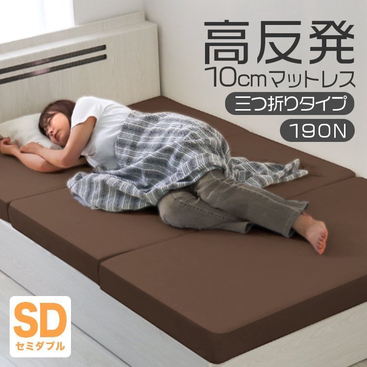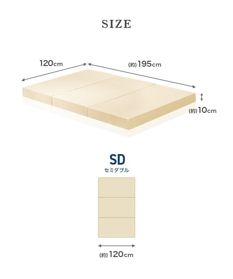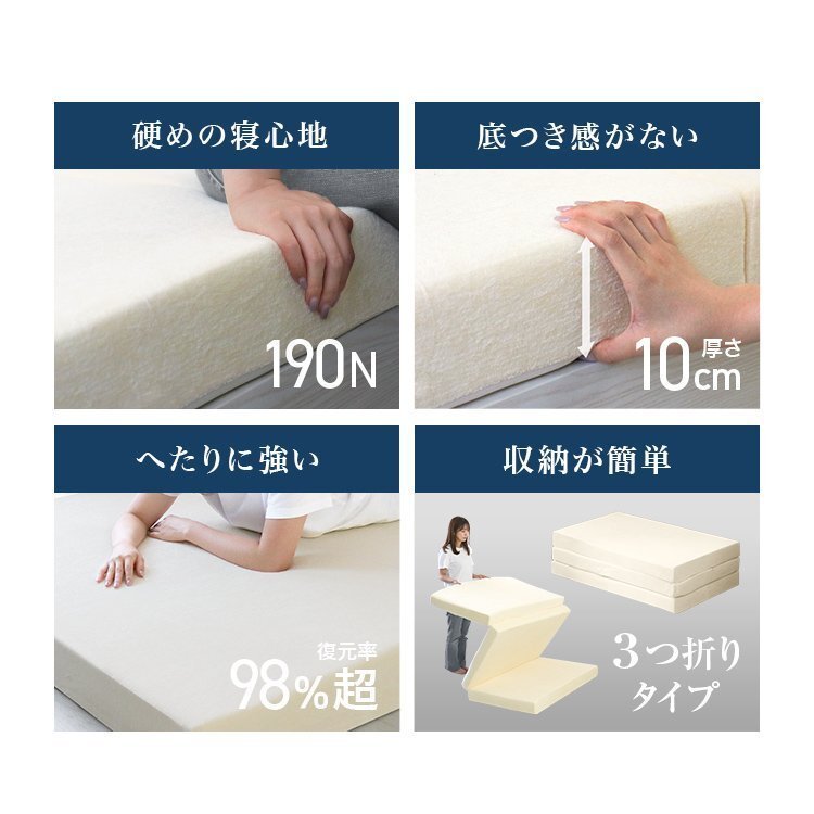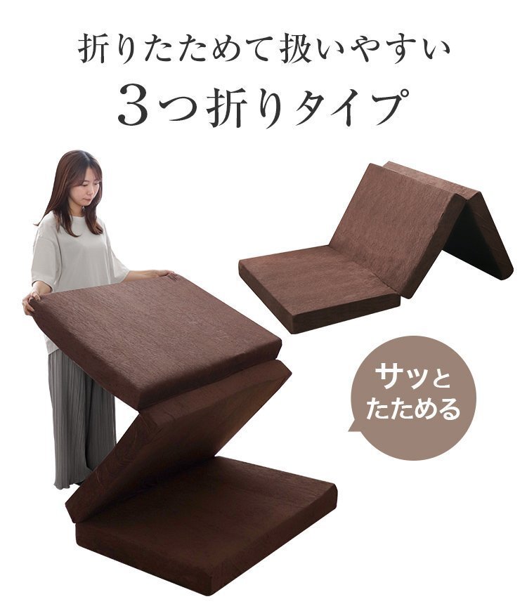 | 厚みたっぷり10cm! 適度な硬さで身体をしっかり支える、三つ折りタイプの高反発マットレスです。 柔らかいマットレスとは違い、身体の沈み込みを軽減した腰に優しい寝心地です。 高反発マットレスのウレタンフォームは弾性が高く、 適度な硬さで身体を支えるので、底つき感もなくへたりにくいマットレスです。 寝返りが多い方や仰向けに寝ることが多い方におススメです。 簡単にたためる三つ折りタイプなので、お部屋で立て置きして日当たりのいい場所で部屋干しが可能! 取り外しやすいL字ファスナー付き洗えるカバーが付属しています! ■商品コード:FEB003BR ■商品仕様 カラー:ブラウン サイズ(約)195cm×120cm×10cm(セミダブルサイズ) ※折りたたみ時:(約)65cm×120cm×30cm 重量(約):7.2kg 素材:高反発ウレタン 、パイル生地 他 硬さ:190ニュートン ■注意事項 ・圧縮梱包されたままの状態で長期間保管した場合、マットレスが復元できなくなってしまいます。 商品到着後、1週間以内に必ず圧縮から開放をして頂くようにお願いいたします。 ・マットレスは約1-2日で復元します。気温や温度により3-14日かかる場合もあります。 ・製品の臭いが気になりましたら、風通しの良いところで脱臭してください。 この臭いは素材のウレタンによるもので無害です。臭いに敏感な方は十分ご検討の上、ご購入をお願いいたします。 ・マットの硬さは温度によって変わってきます。また、硬さの感じ方には個人差があります。 ・カバーは取り外して洗濯ができますが、マットレス本体は洗濯しないでください。 ・生産ロットによって復元率・ニュートンに差異が生じる場合があります。 ・商品は、モニターによって色合いが異なって見える場合があります。 ・仕様・デザインは改良のため予告なく変更することがあります。 ■保障期間 7日間 ※商品到着後7日以内の初期不良・破損のみご対応させていただきます。 【新品未使用品です】 |