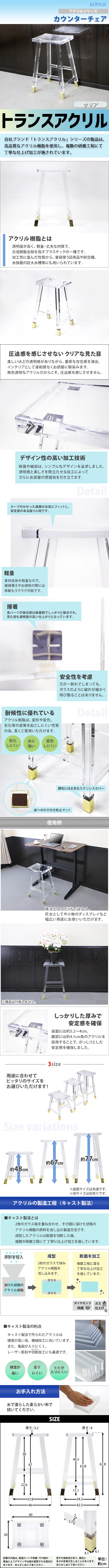 | 商品名 | 送料無料 アクリル カウンターチェア ハイスツール チェア 椅子 chair クリア 透明 スケルトン 無色透明 スツール 花台 インテリア 家具 アクリル樹脂 ダイニング リビング キッチン バー カフェ シンプル おしゃれ 1人掛け 背もたれなし スクエア 四角 イス acchair48012cl |