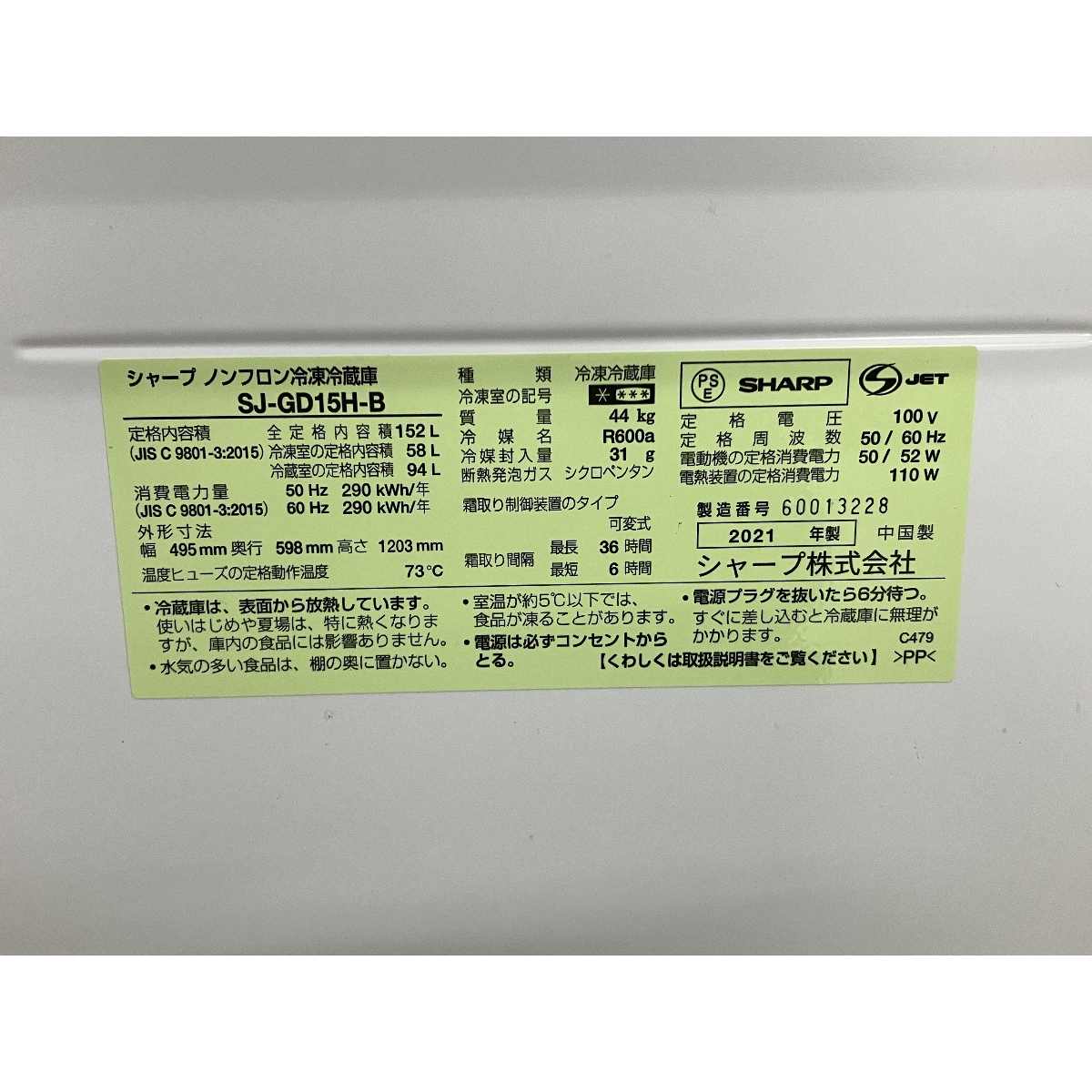 | SHARP シャープ SJ-GD15H-B 冷凍冷蔵庫 2021年製 152L 冷蔵庫 キッチン 家電 中古 楽 M10608066 |