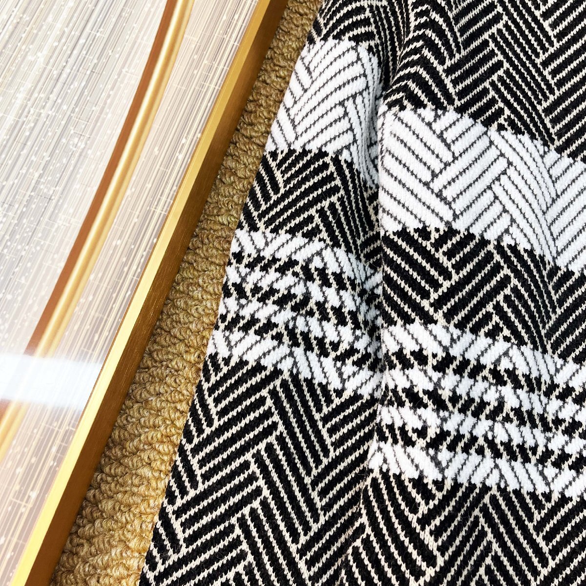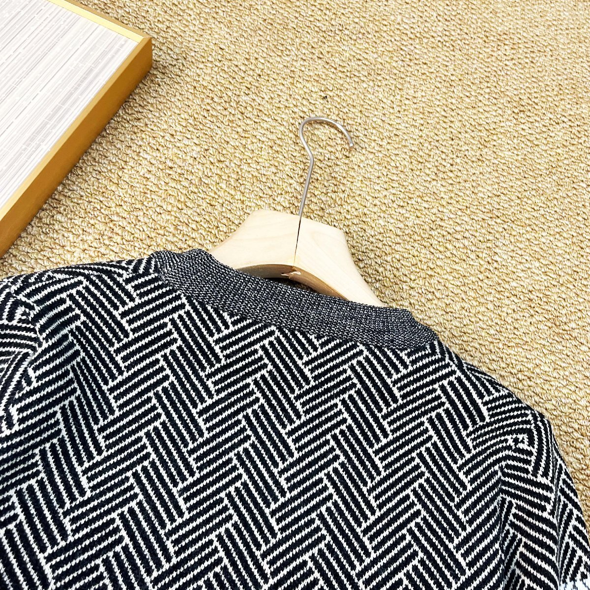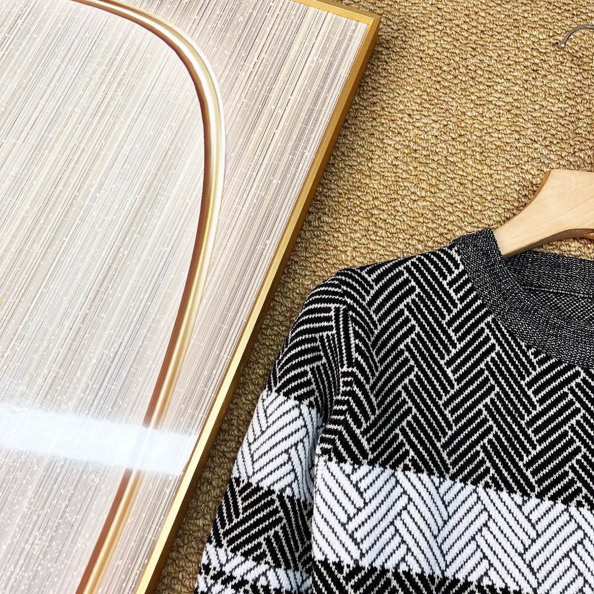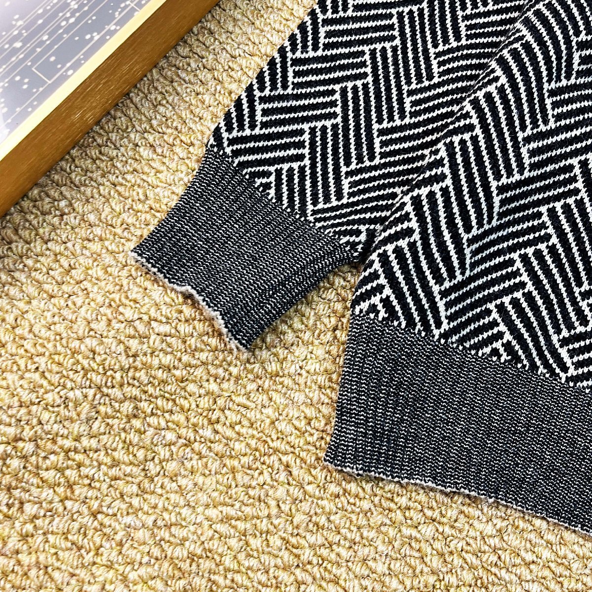 全体にシャープな雰囲気の総柄をあしらい、胸元にはボーダー柄をアクセントとして配置した、メリハリのあるデザインです。シンプルながら視線を惹きつける表情豊かな柄が、コーディネートに立体感を添えます。袖口と裾はリブで引き締め、ほどよいフィット感と自然なシルエットを実現。ゆったりしすぎない絶妙なバランスで、リラックスした着心地と美しいラインを両方叶えます。