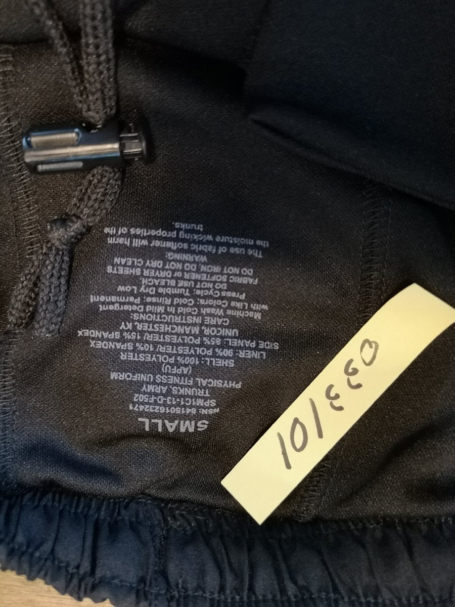 USアーミー放出品の本物トレーニングジョグパンツ。画像で見にくいですが両サイドにも ストレッチ素材を使っています。またウエストには紐も通っておりますのである程度は 絞っていただけると思います。ポリエステール素材、SUPPLEXのトランクス型のインナー付き。 サイズSは全長40cm、股下12cm、ウエストが60から80センチ程度です。 ヤマトネコポス便にて全国200円でお送りいたします。落札価格にプラスでお願いします。