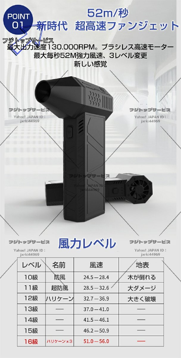 ・130,000rpmの強力な風力。強運転は風速52m/秒の強い風が出る