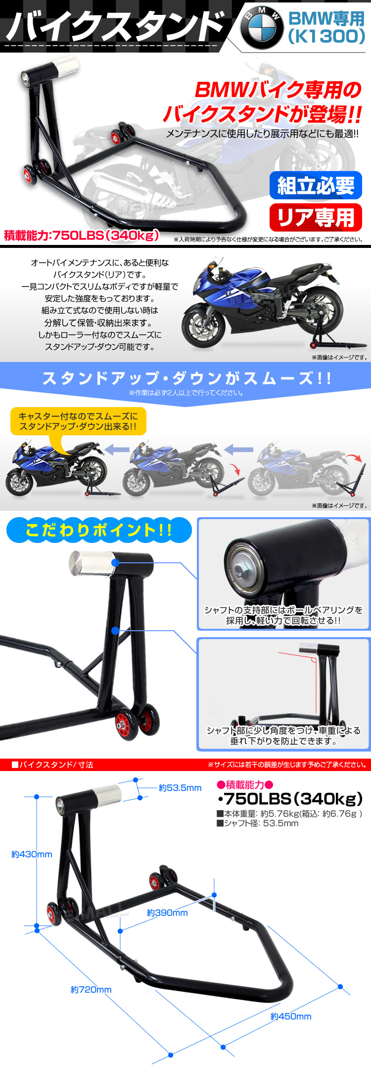 | オートバイメンテナンスにあると便利なフロント専用バイクスタンドです。 一見コンパクト、スリムなボディですが軽量ながらも安定した強度をもっております。 組み立て式なので分解して保管・収納出来ます。 キャスター付でスムーズに スタンドアップ・ダウン可能です。 【商品仕様】 積載能力: 750LBS(340kg) シャフト径: 53.5mm 本体重量: 約5.76kg |